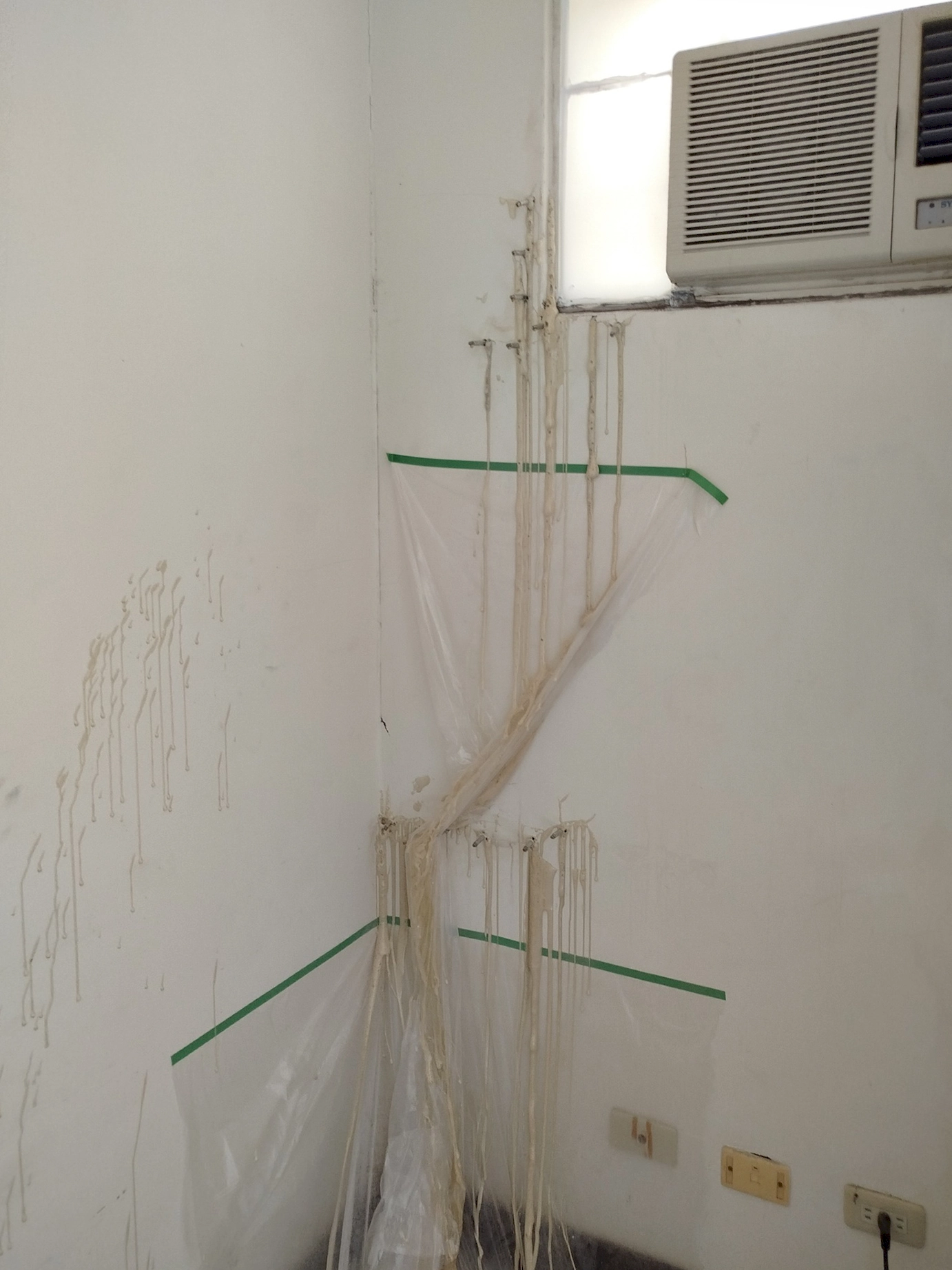 ▼另一間房間則是冷氣旁牆面,以及陽台旁牆面出現滲水狀況,同樣採用高壓灌注方式進行修復,先封堵牆壁結構內的滲水路徑,再進行後續修補處理。