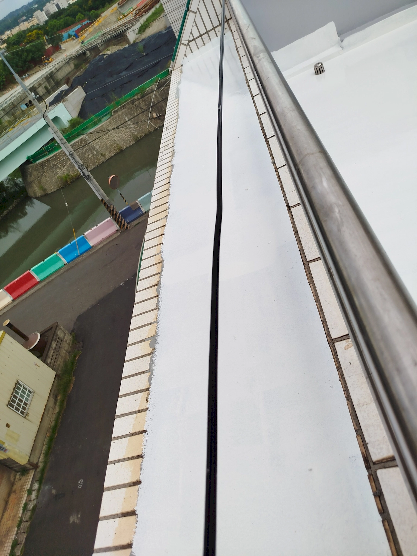 ▼ 屋頂邊牆有一處凹槽,這邊也同樣有進行防水工程,並針對邊角與收邊位置加強處理,避免雨水沿接縫滲入,提升整體防水完整性。