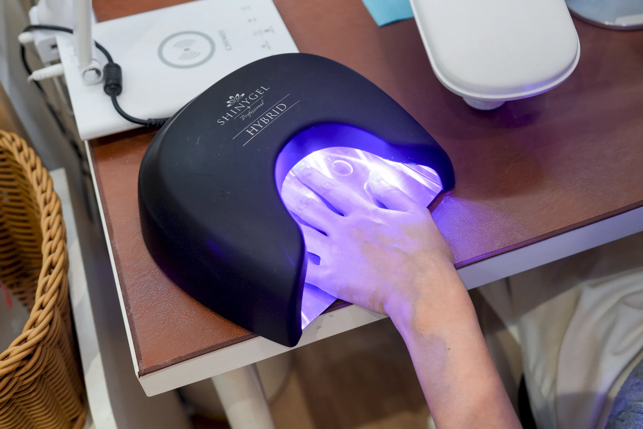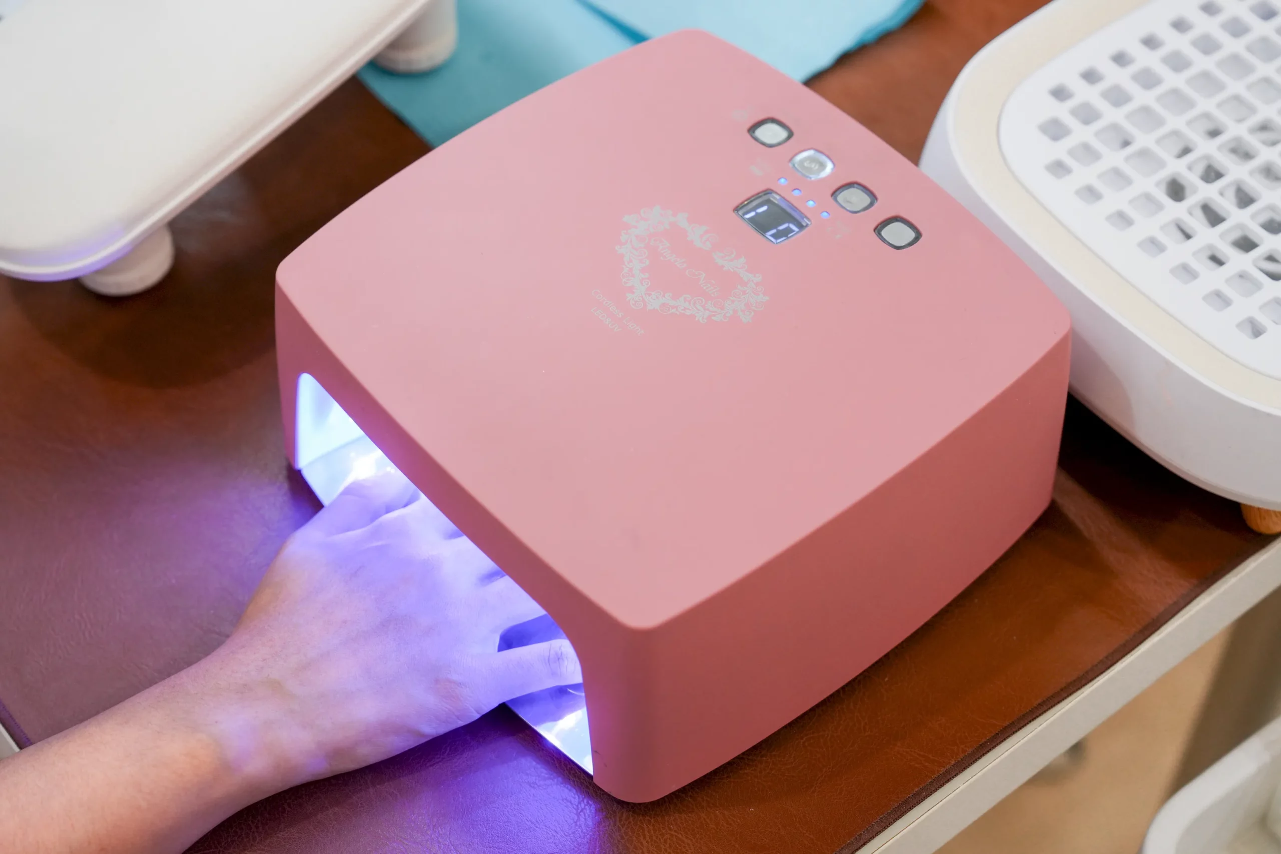 ▼每上完一層指甲油就需要將手放入光療機裡照光一次,左右邊各有一台光療機,可以同時將左右手都放進去,不僅能大幅節省照光等待的時間,也能讓整個流程更加流暢。不過兩台光療機的照光效果似乎不太一樣,左手那一台每次照光都需要多照一次。