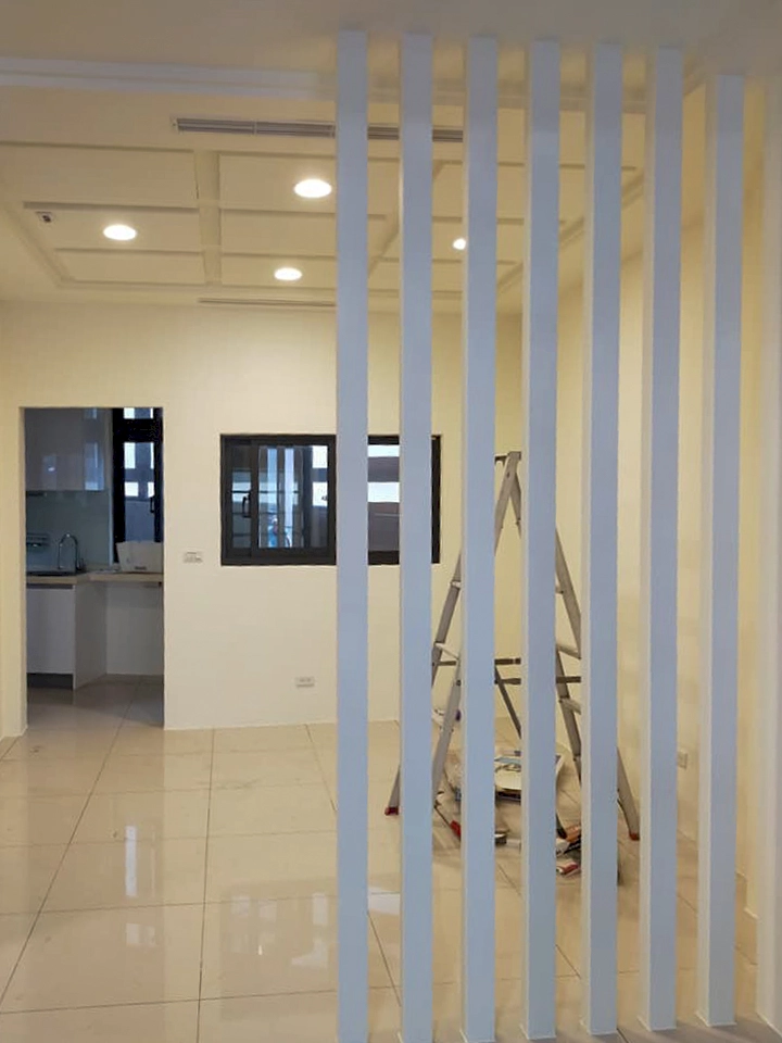 ▼客廳與廚房之間設計了白色的屏風格柵,這種多面、細長型的結構最難刷得均勻,但漆家樂的師傅處理得非常好,每一根格柵的漆面都很平整滑順,天花板與地面接縫收邊也是乾淨俐落。