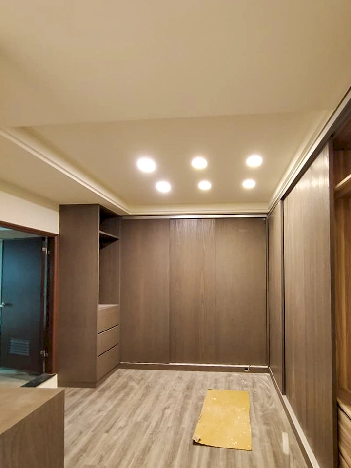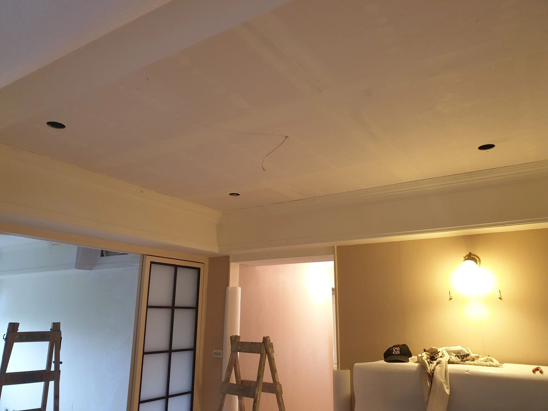 細膩手藝小心處理天花板與系統櫃銜接處,收邊線條乾淨俐落,施工仔細,確保油漆絕不沾染家具與櫃體,細節處盡顯職人精神。