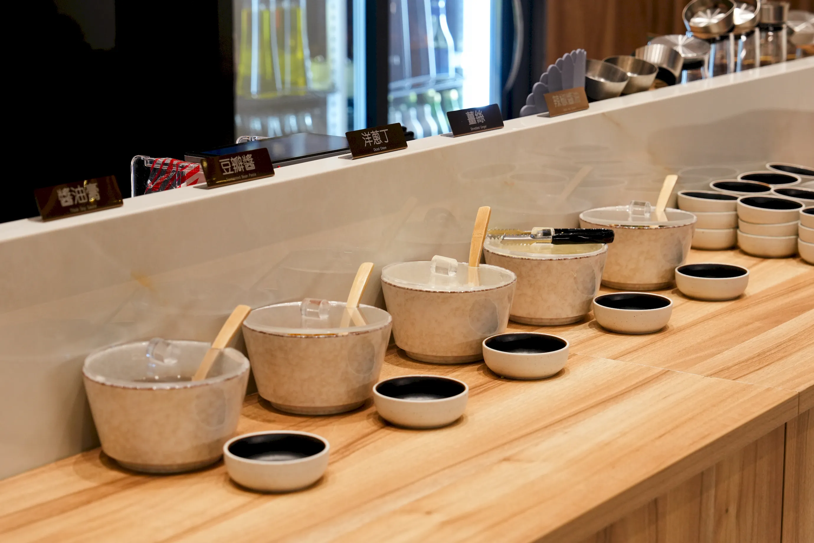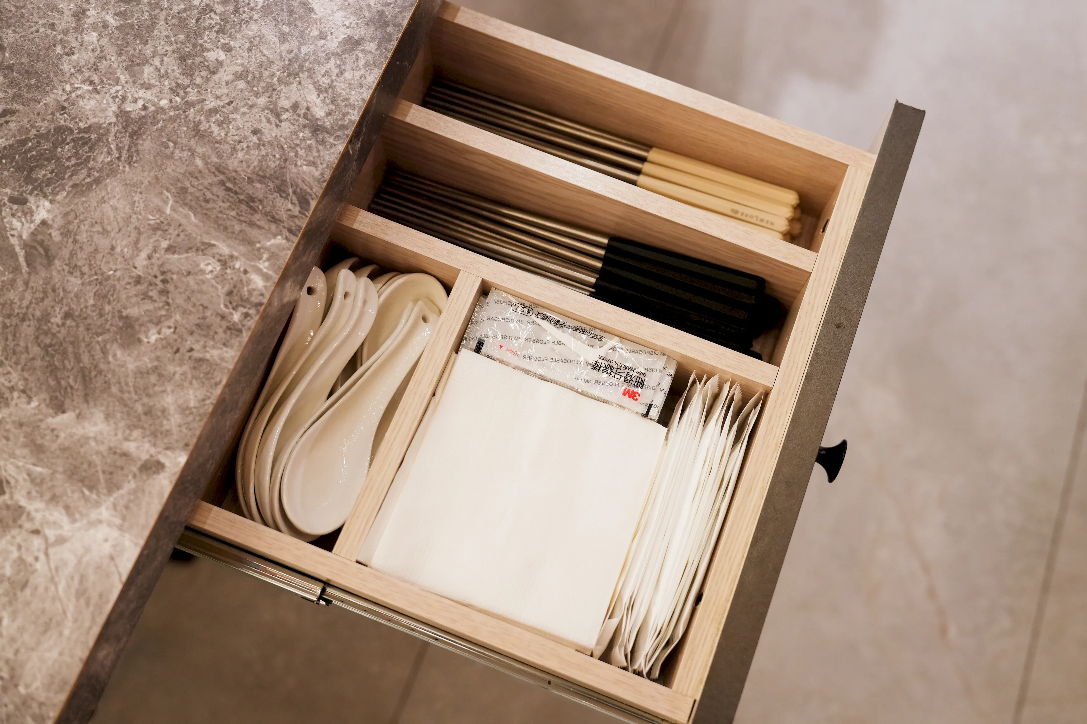 ▼桌邊的抽屜裡備有備品,筷子還有兩種顏色可以區分使用,方便用餐時辨識,相當貼心。