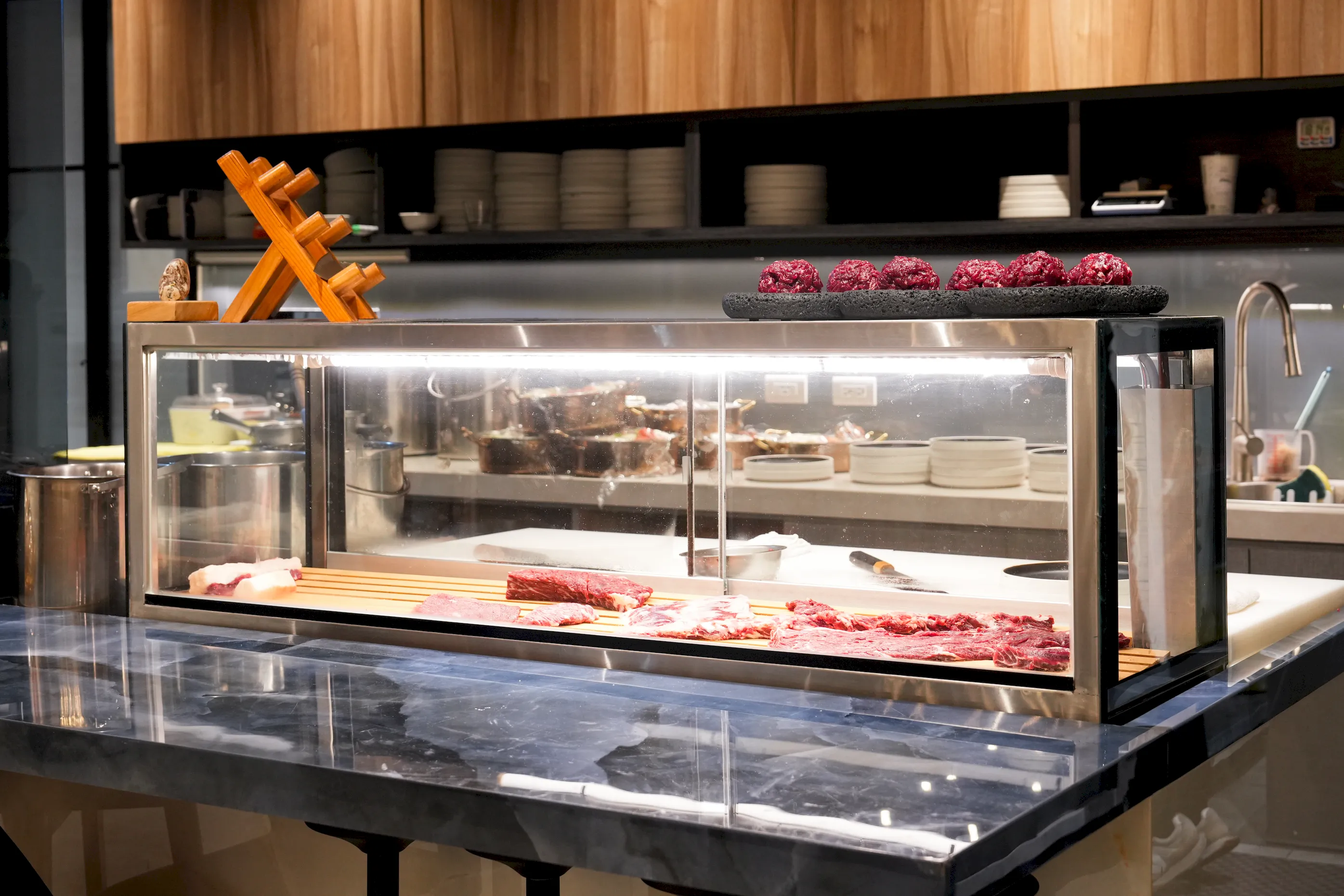 ▼櫃檯旁的冷藏櫃陳列的就是當日的新鮮溫體牛。