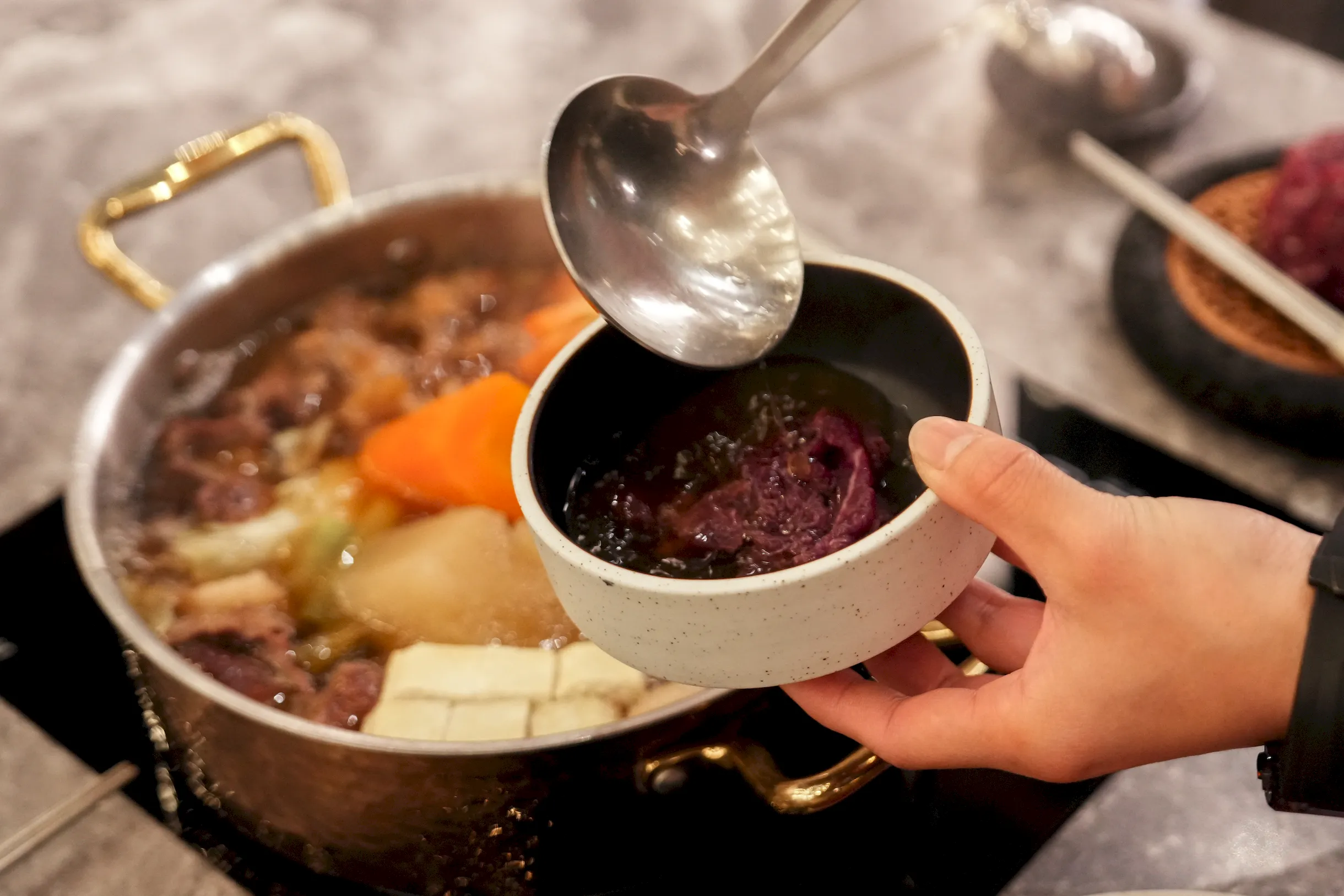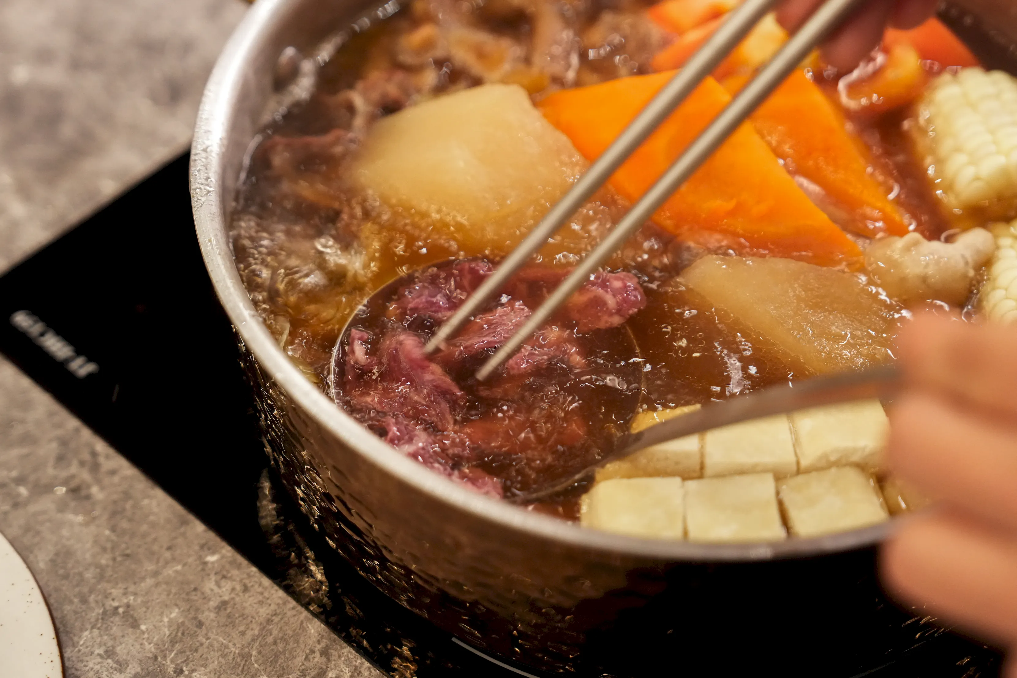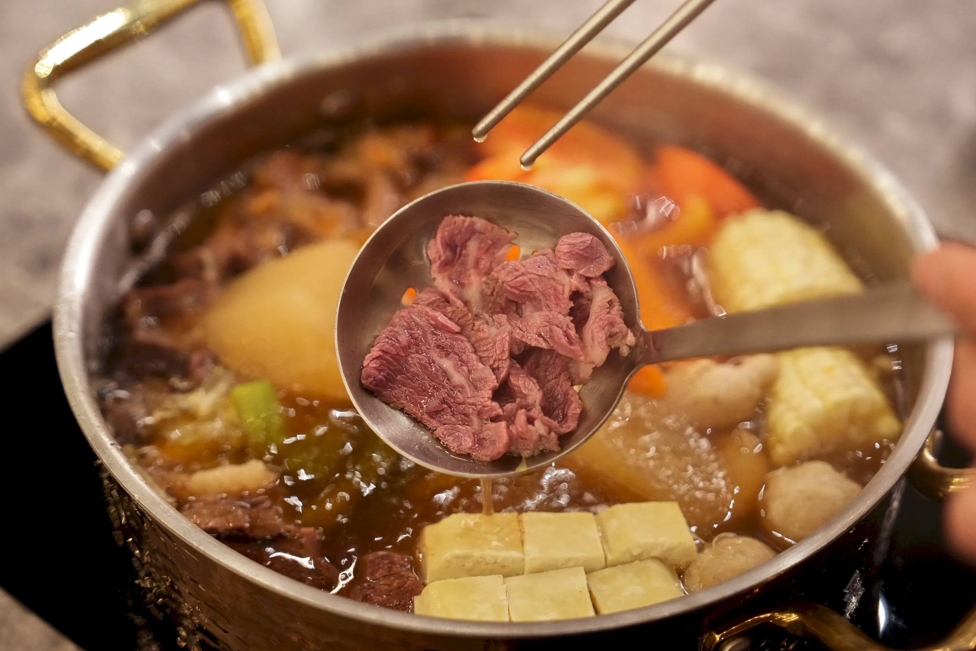 其中,使用在鍋底內的牛腩、牛筋也完全不馬虎,塊狀的牛腩軟嫩且份量充足,牛筋則是膠質滿滿,口感軟黏滑順。 湯頭喝起來帶有點甜味,還有微微的奶香感,整體算是清甜型湯頭,不過我個人不太習慣帶甜的湯頭,這部分就見仁見智了。