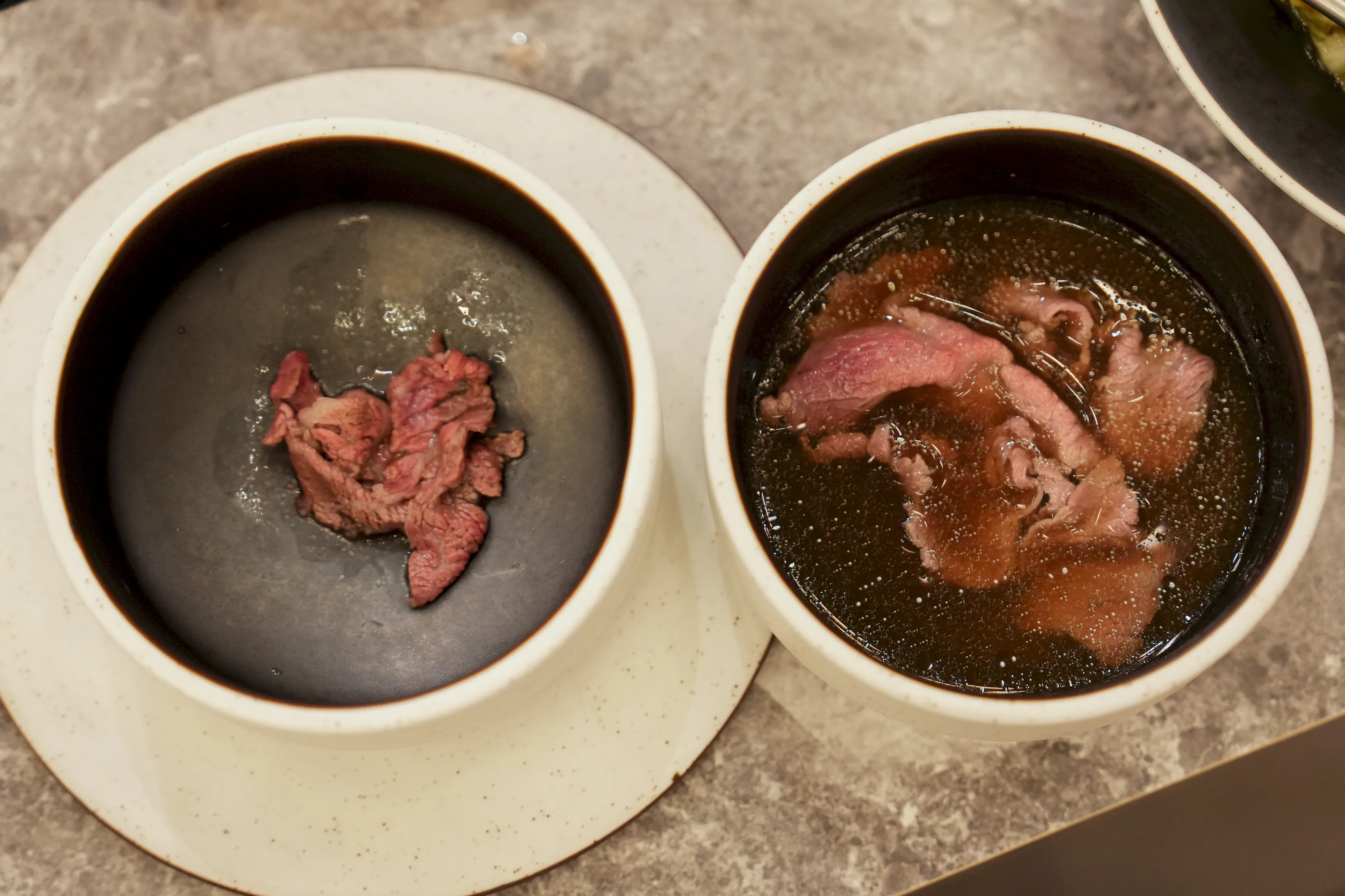 ▼夾取2~3片牛肉,放到碗裡,沖入高湯。一勺約三分熟;兩勺約五分熟。