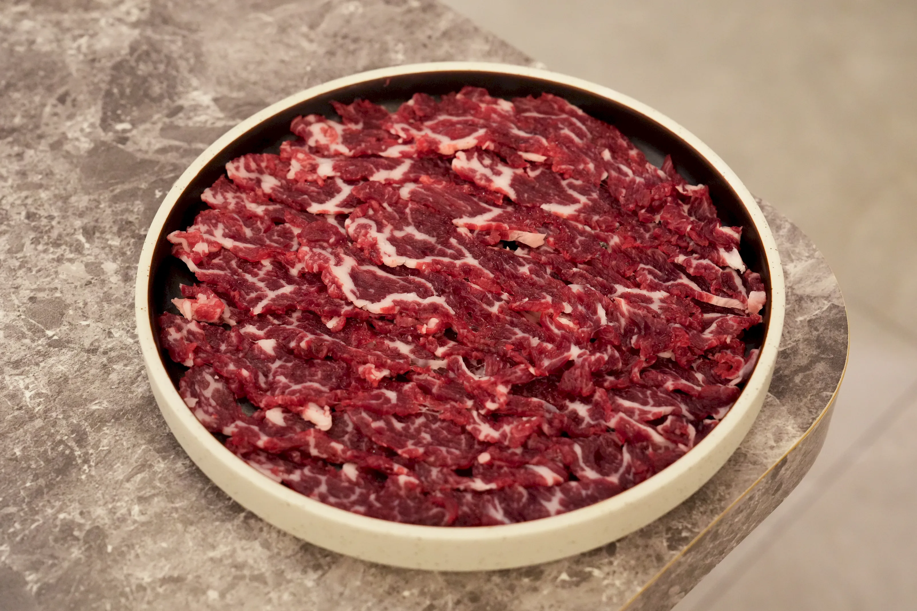 - 「牛腱心」是腿部的精華部位,筋肉比例最佳,下鍋輕涮約3秒,口感吃起來是Q彈Q彈的,不會有明顯的筋感。