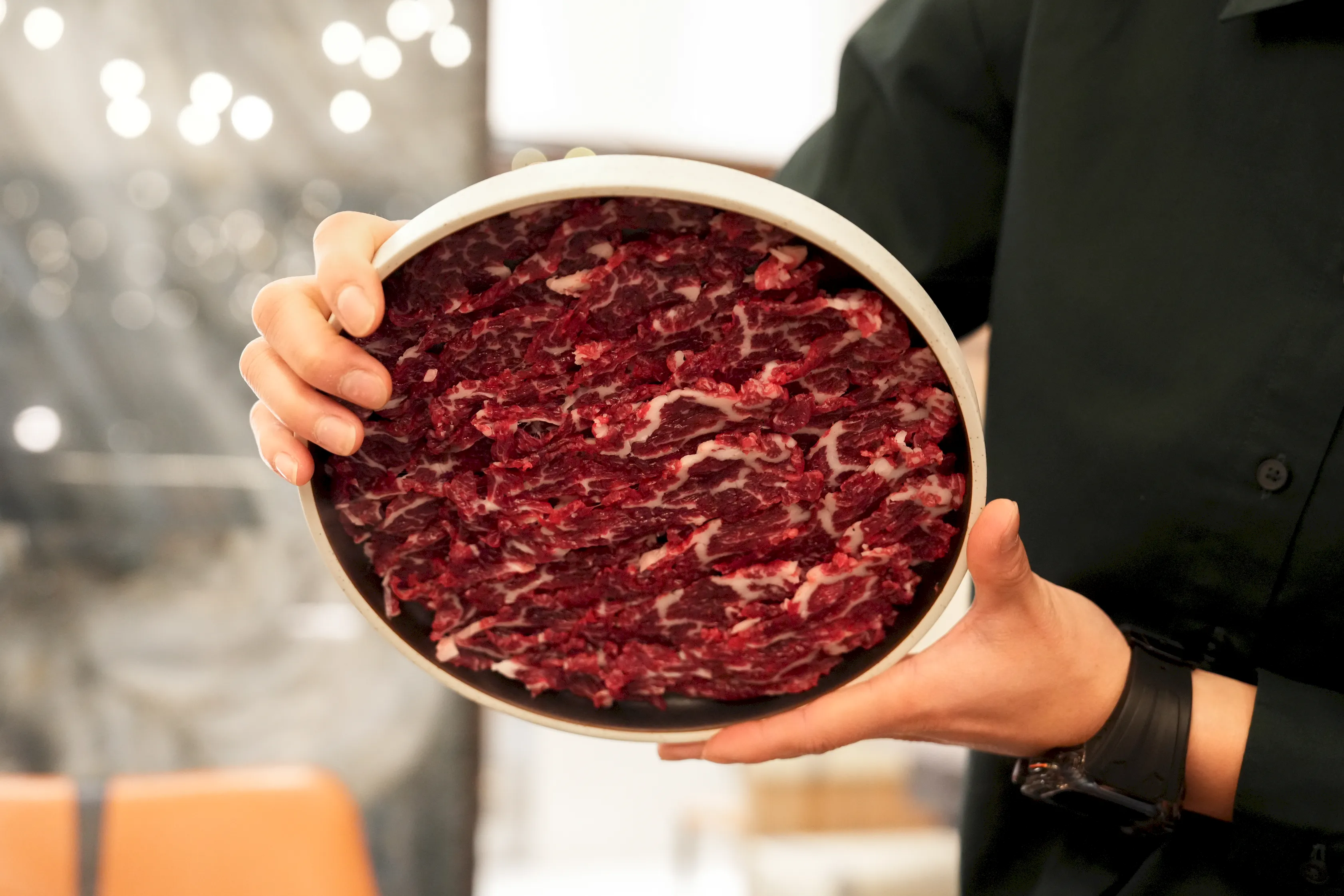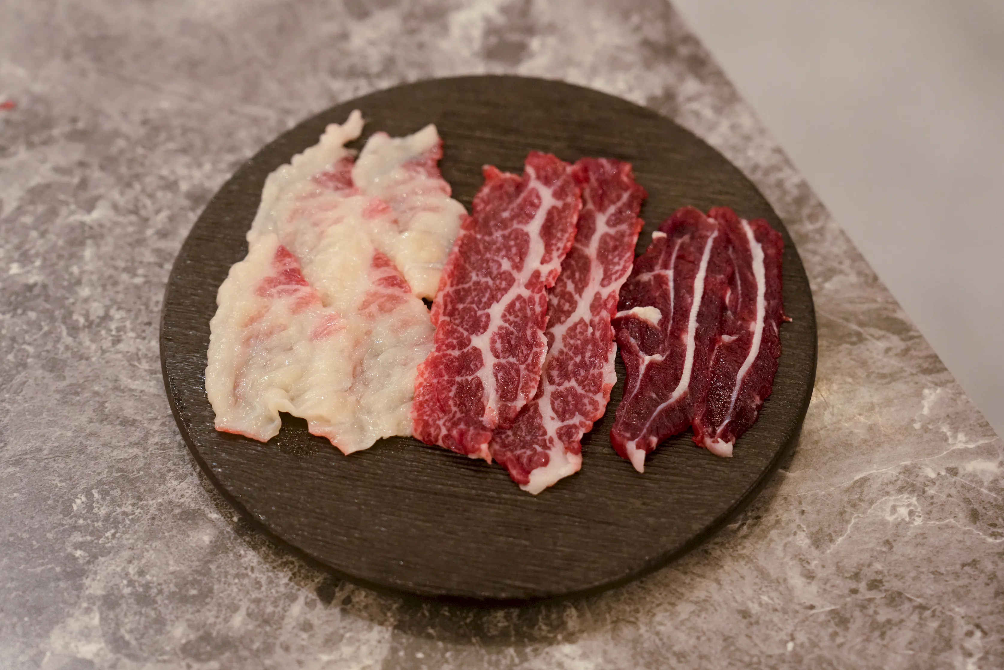 ▼當天招牌牛肉盤使用的部位是後腿肉,下鍋輕涮約3秒即可起鍋,吃起來的口感帶有適度的嚼勁,扎實卻完全不乾柴,非常適合喜歡有咀嚼感的朋友。