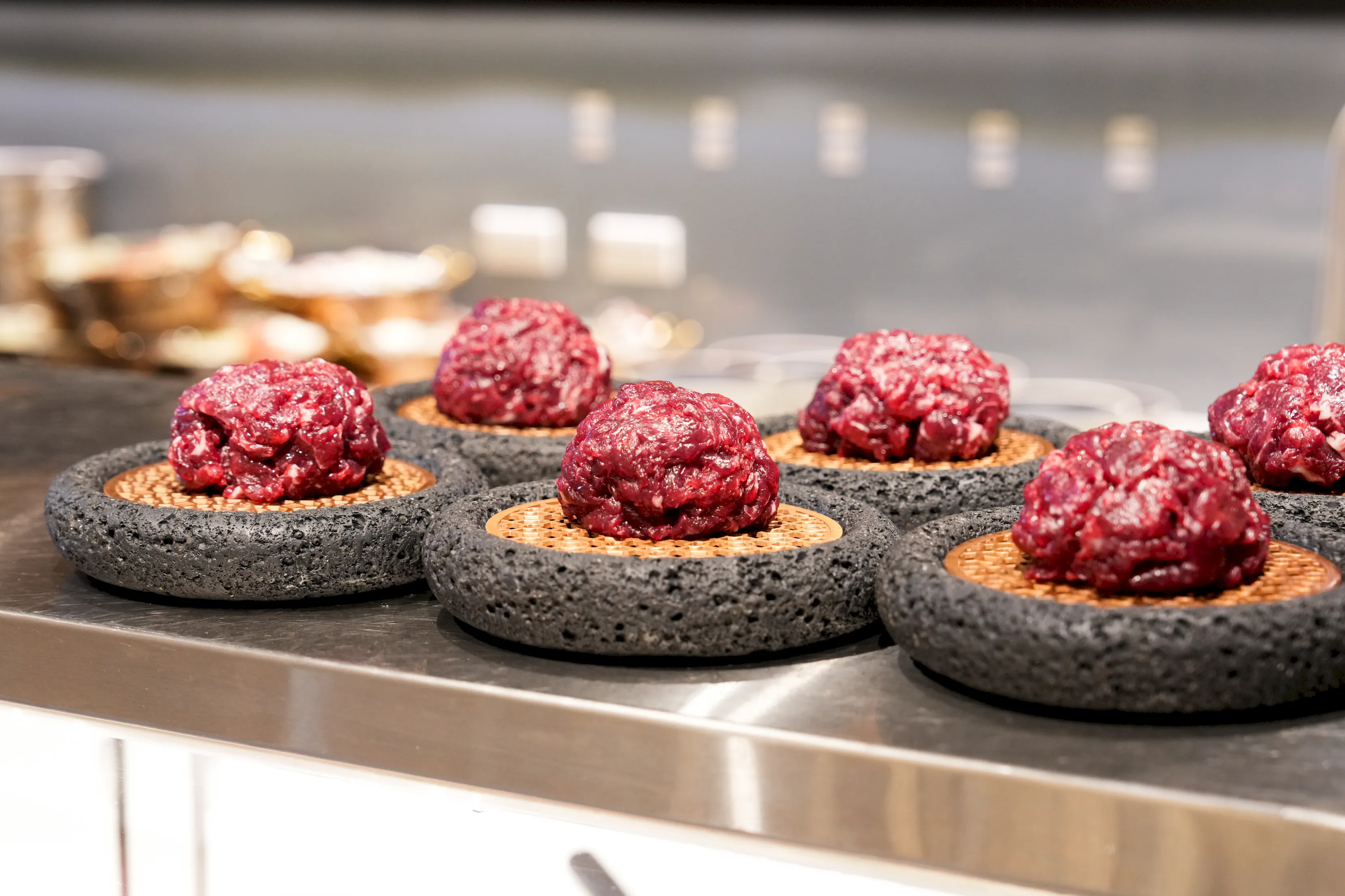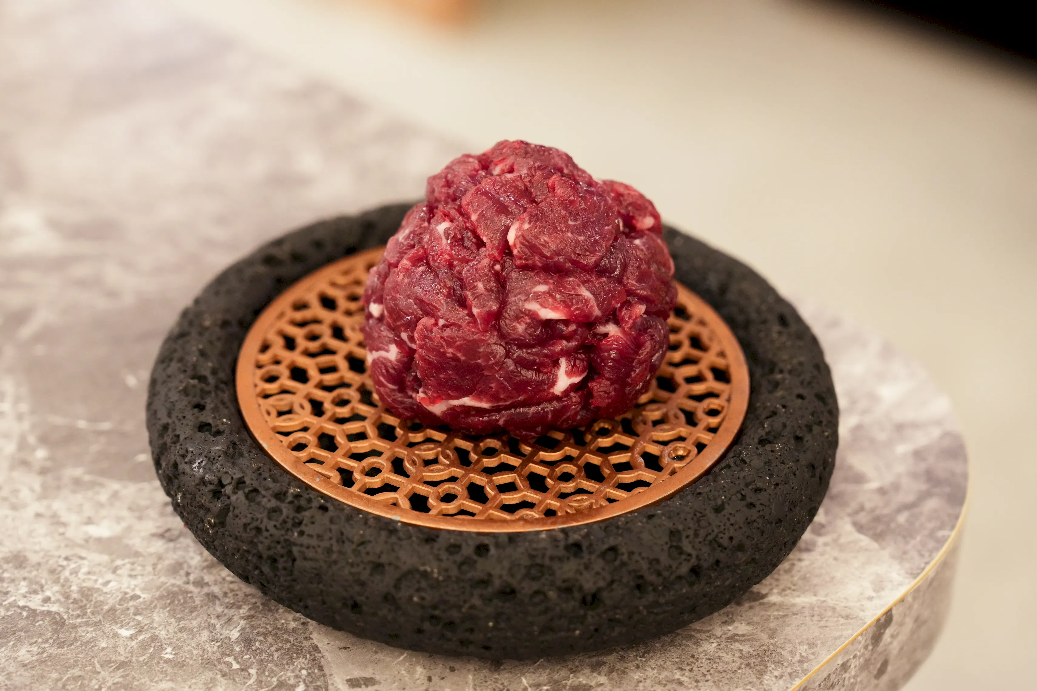 ▼招牌牛肉盤會將溫體牛捏成一顆球狀,因為牛肉新鮮,仍保有組織的彈性,因此才能塑形成球狀而不會散開。