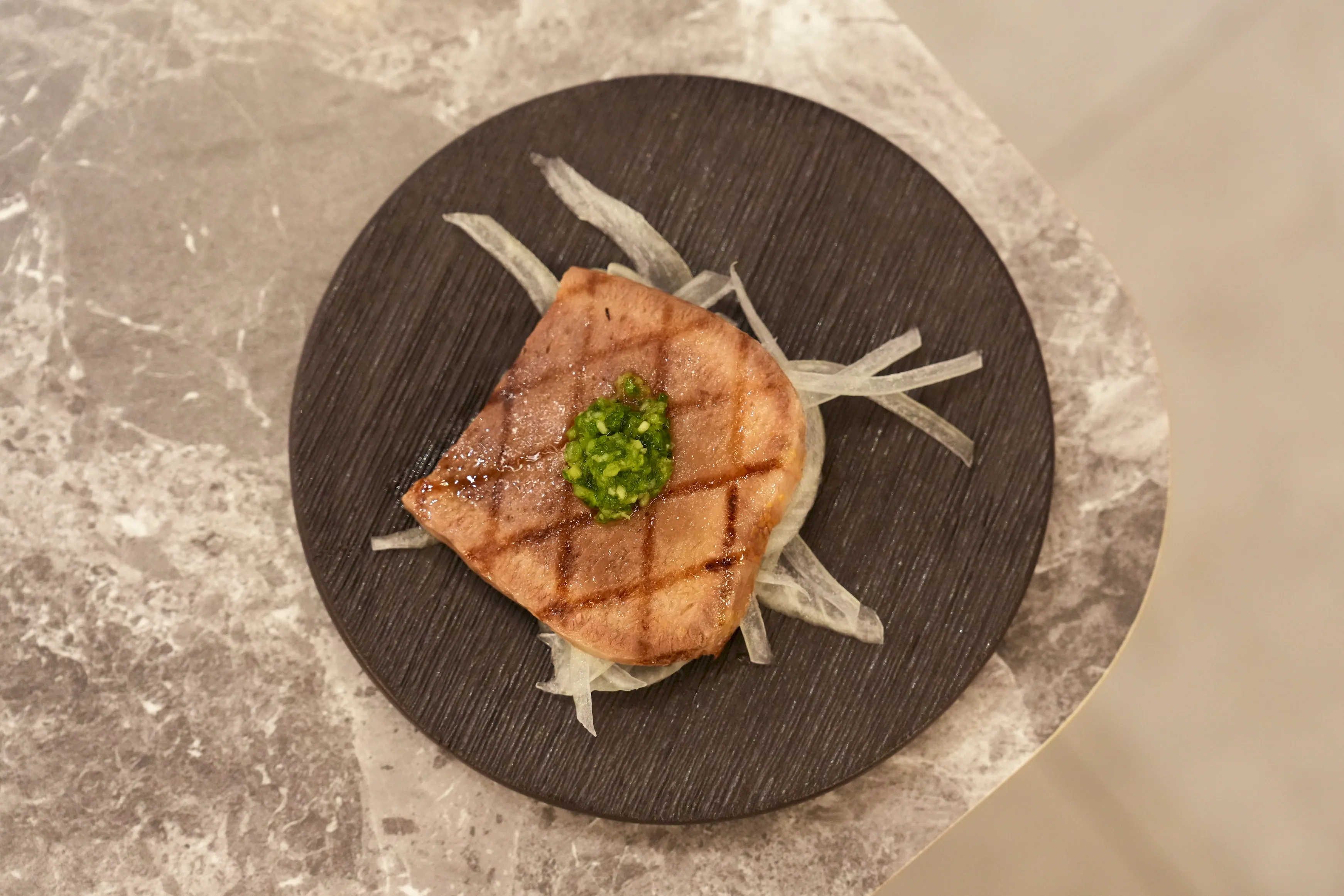 ▼烤牛舌可以點單片嚐鮮真的很貼心,牛舌本身帶有厚度,吃起來口感軟Q軟Q。搭配上方的蔥鹽提味,底部還鋪了一層生洋蔥,整體風味層次豐富;不過因為我比較不喜愛生洋蔥的味道,所以口味上沒有特別對上我的個人喜好。