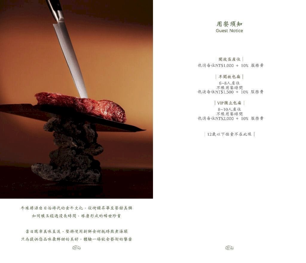 ▼「牛琅溫體牛火鍋」的一般開放座位區用餐時間為 120 分鐘,包廂座位區則不限用餐時間,兩者皆會酌收 10% 服務費。在菜單中雖未特別標示非牛肉餐點,但店家其實有提供伊比利豬,若有非牛肉的需求,需要提前向店家預訂。