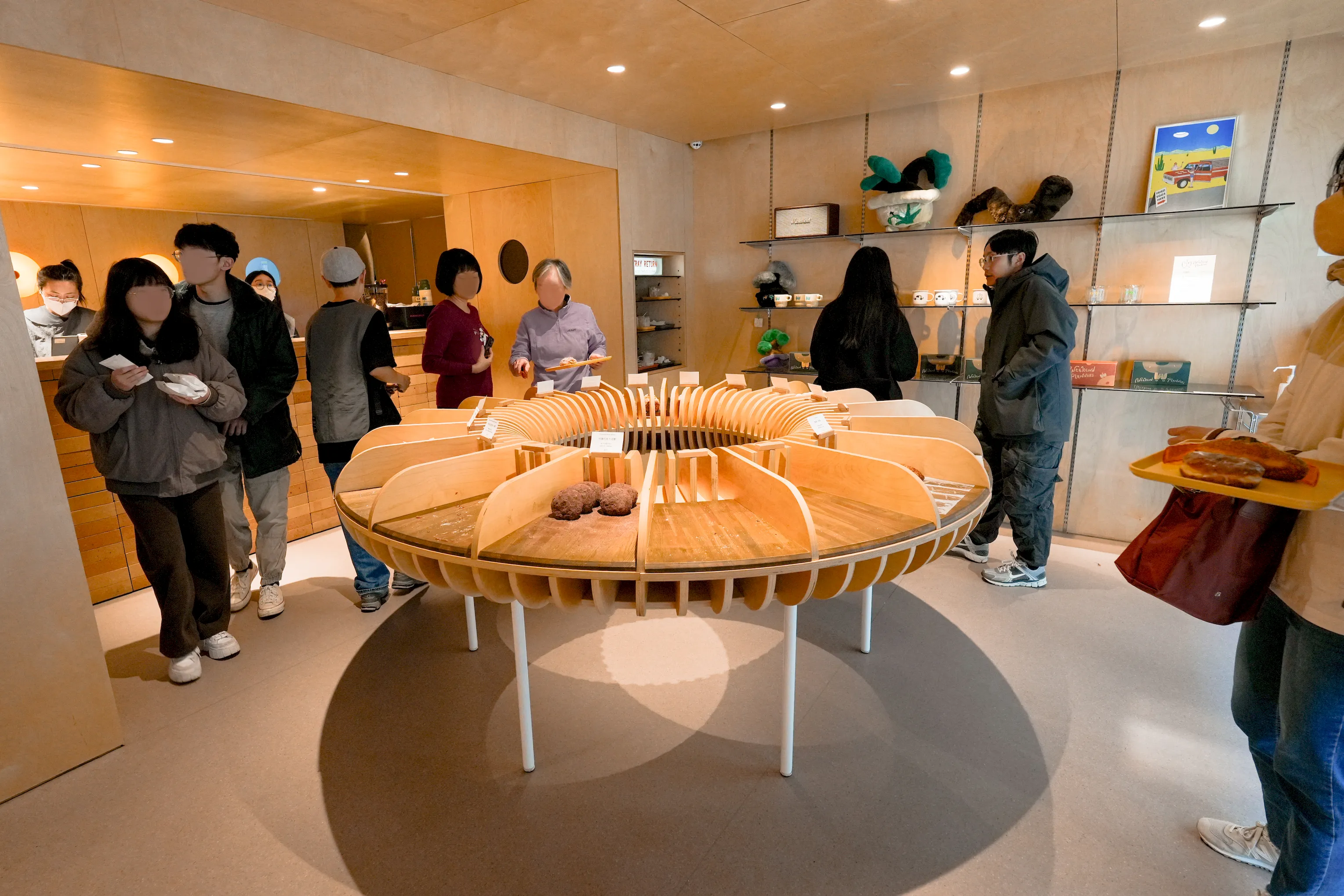▼入店後的右側放有盤子跟夾子,可以用來夾取甜甜圈。牆面上展示的是店家的周邊,以及外帶用的紙盒。最左側的層架,則為內用餐盤自助回收區。