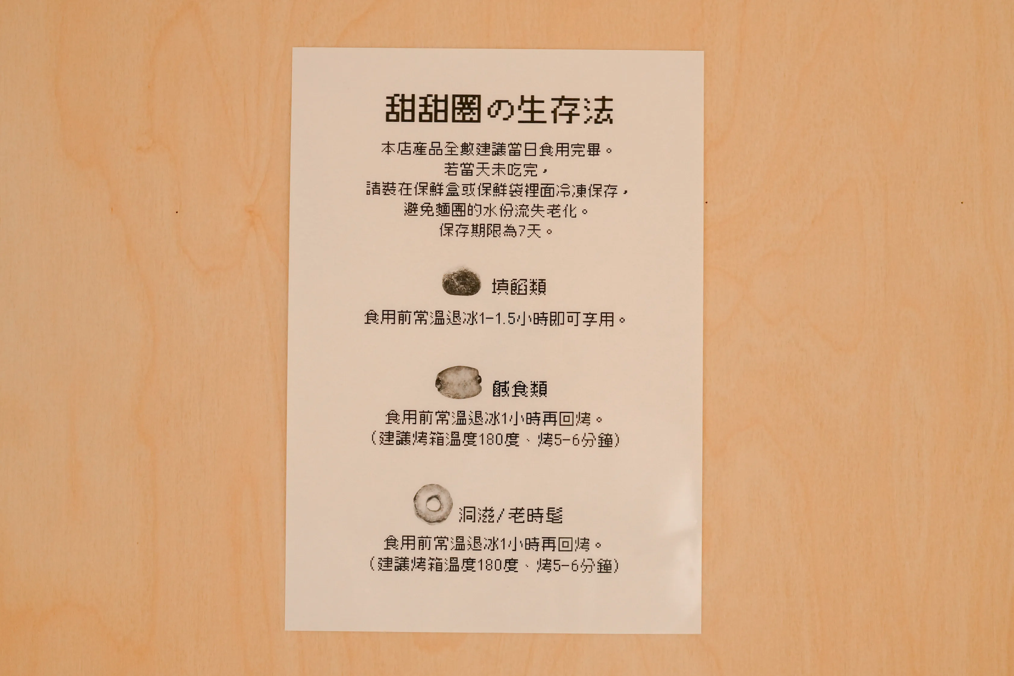 ▼相信不少人跟我一樣,看到滿桌的甜甜圈,一定什麼口味都想來一個吧!店家考量到保存問題,用「甜甜圈の生存法」來說明保存方式,看起來相當俏皮,也確實讓人忍不住多看幾眼。