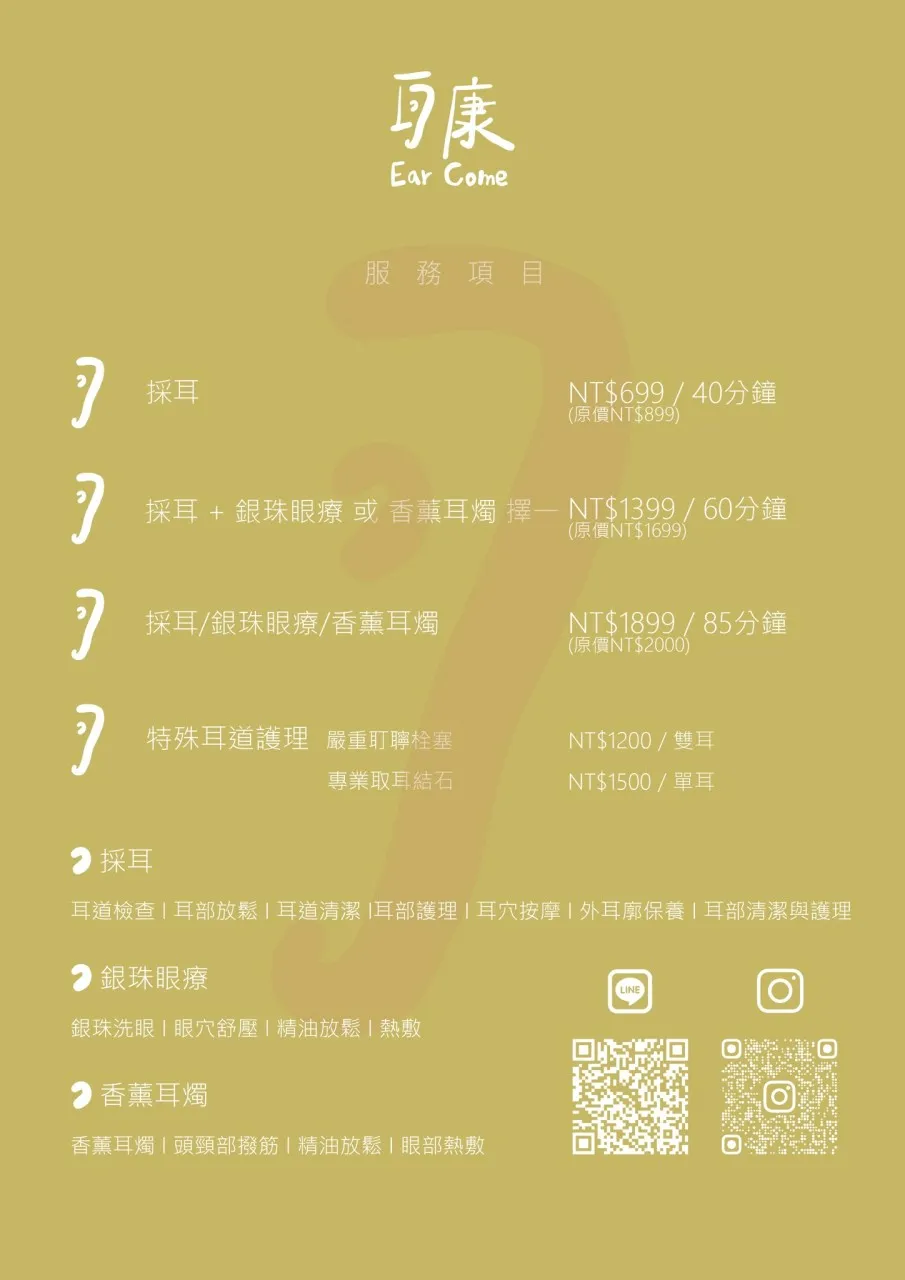 ▼「耳康EarCome」主要提供採耳、耳燭和銀珠眼療三個服務項目,不過主要都是搭配成組合套餐,並沒有單品項目服務,以下為價目表提供給大家參考。