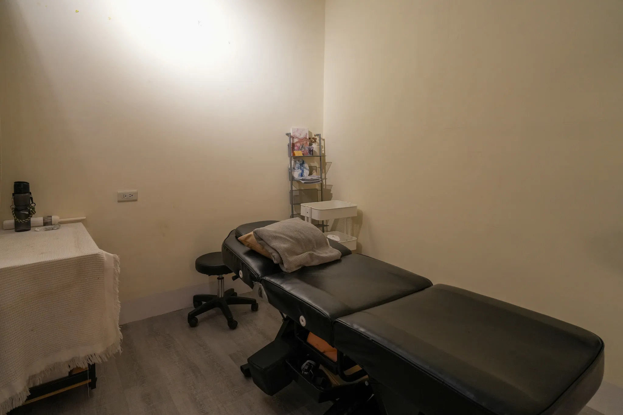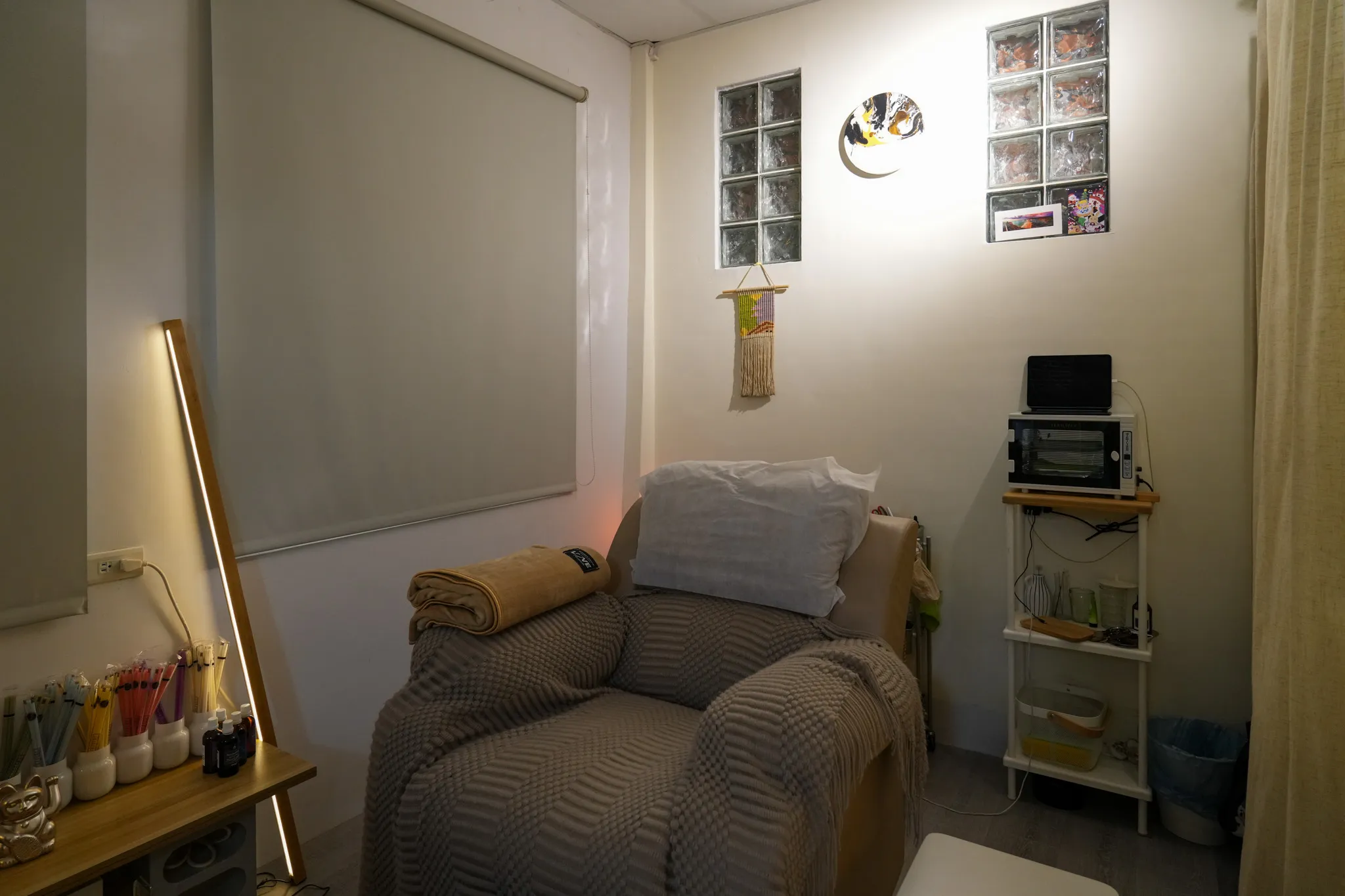 ▼一進到工作室會先看到霧眉用的美容床,中間以布簾做區隔,旁邊才是採耳用的電動沙發椅。