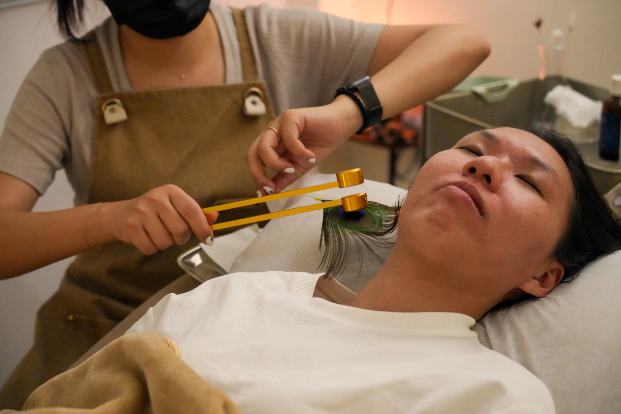 ▼接著會先用耳道鏡讓你看耳道的情況,然後用孔雀羽毛放鬆耳朵,再逐步搭配音叉做更深層的放鬆,兩邊的耳朵都會進行。