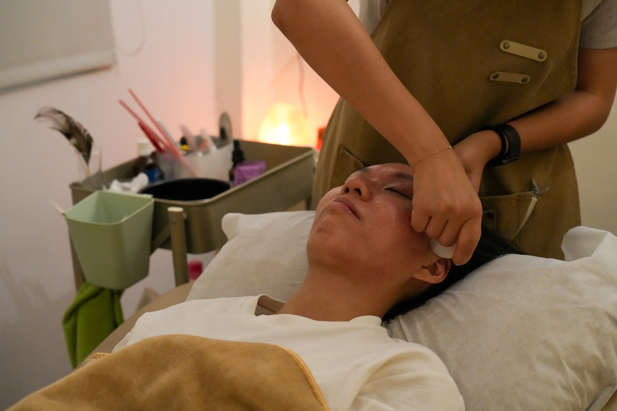 ▼接著會用臉部按摩油搭配玉石刮痧板、刮痧棒做按摩,除了眼睛周圍,還會針對臉部做拉提刮痧的手法。