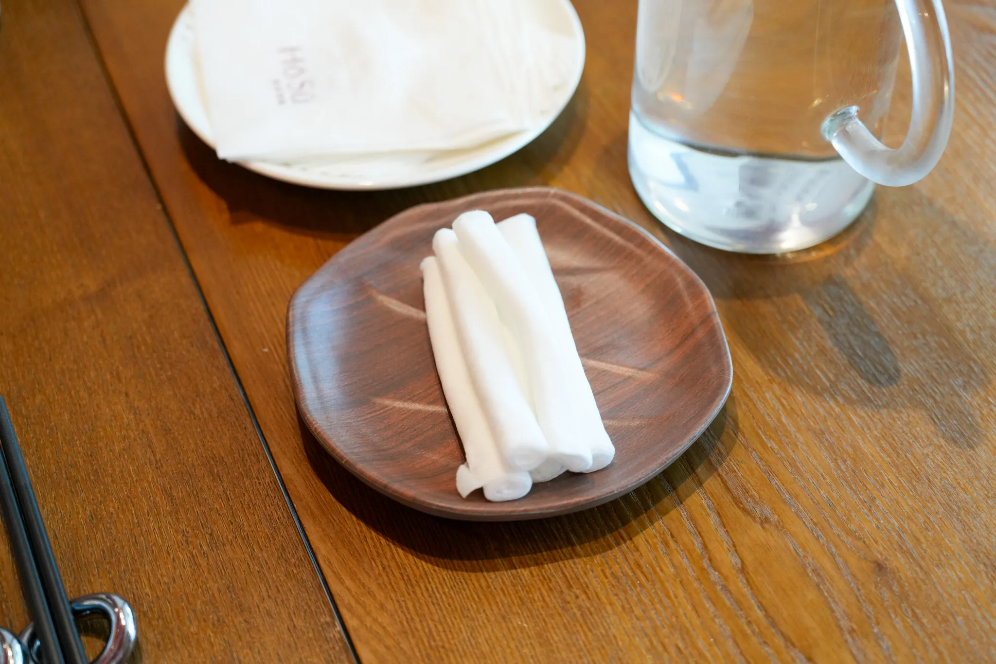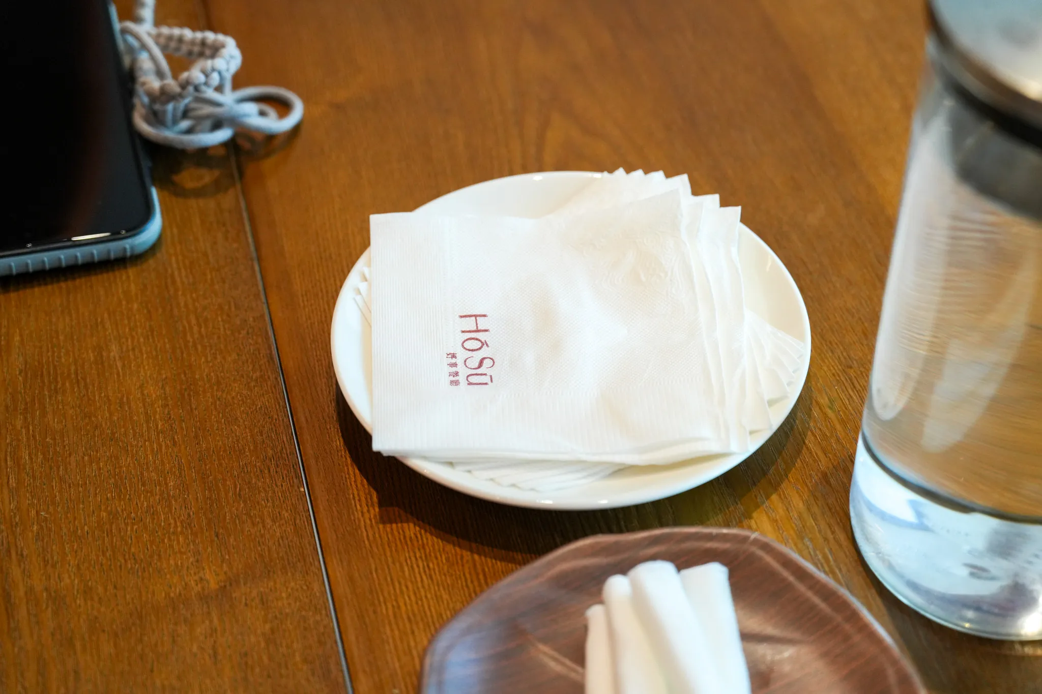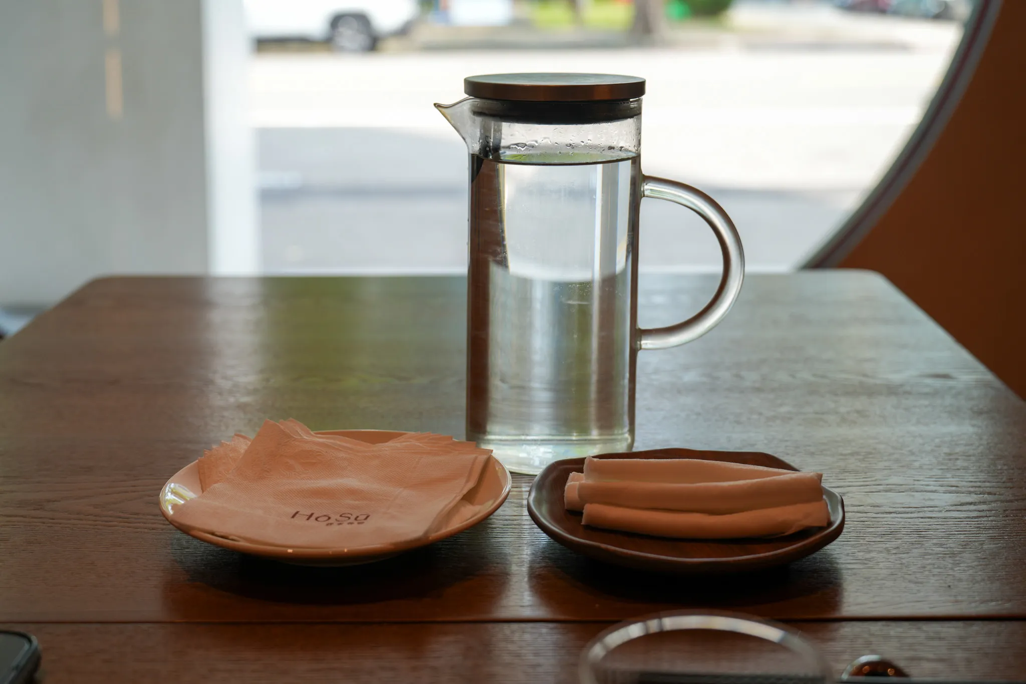 ▼此外,在客人入座前,桌上就會先備好餐巾紙、擦手用的溼紙巾及飲用水,兩人用餐沒點飲品也沒關係。