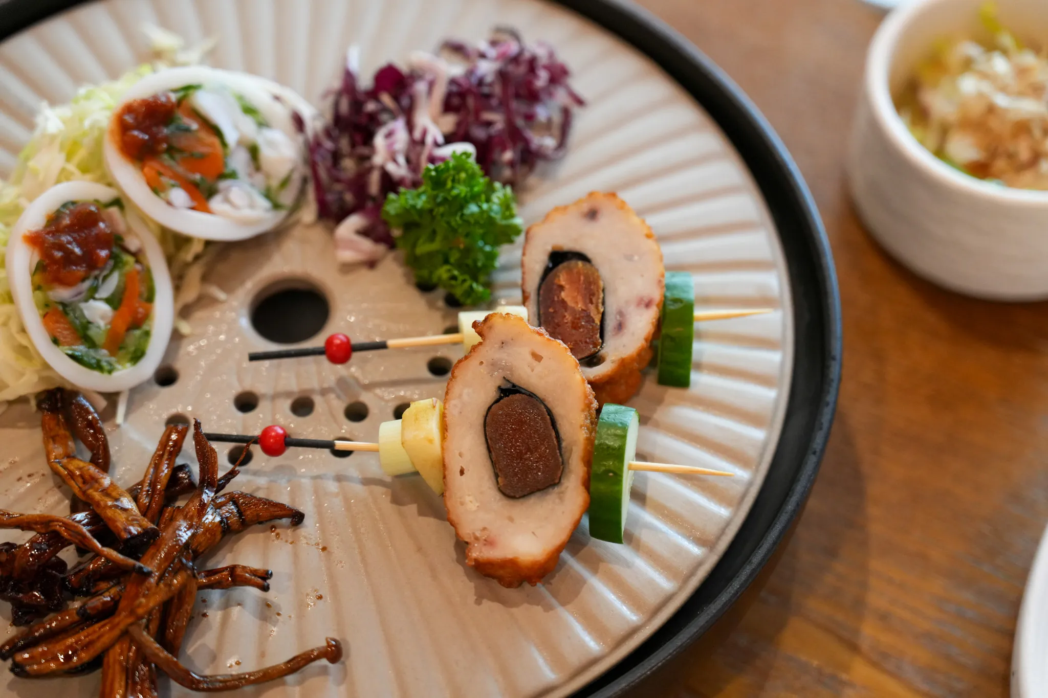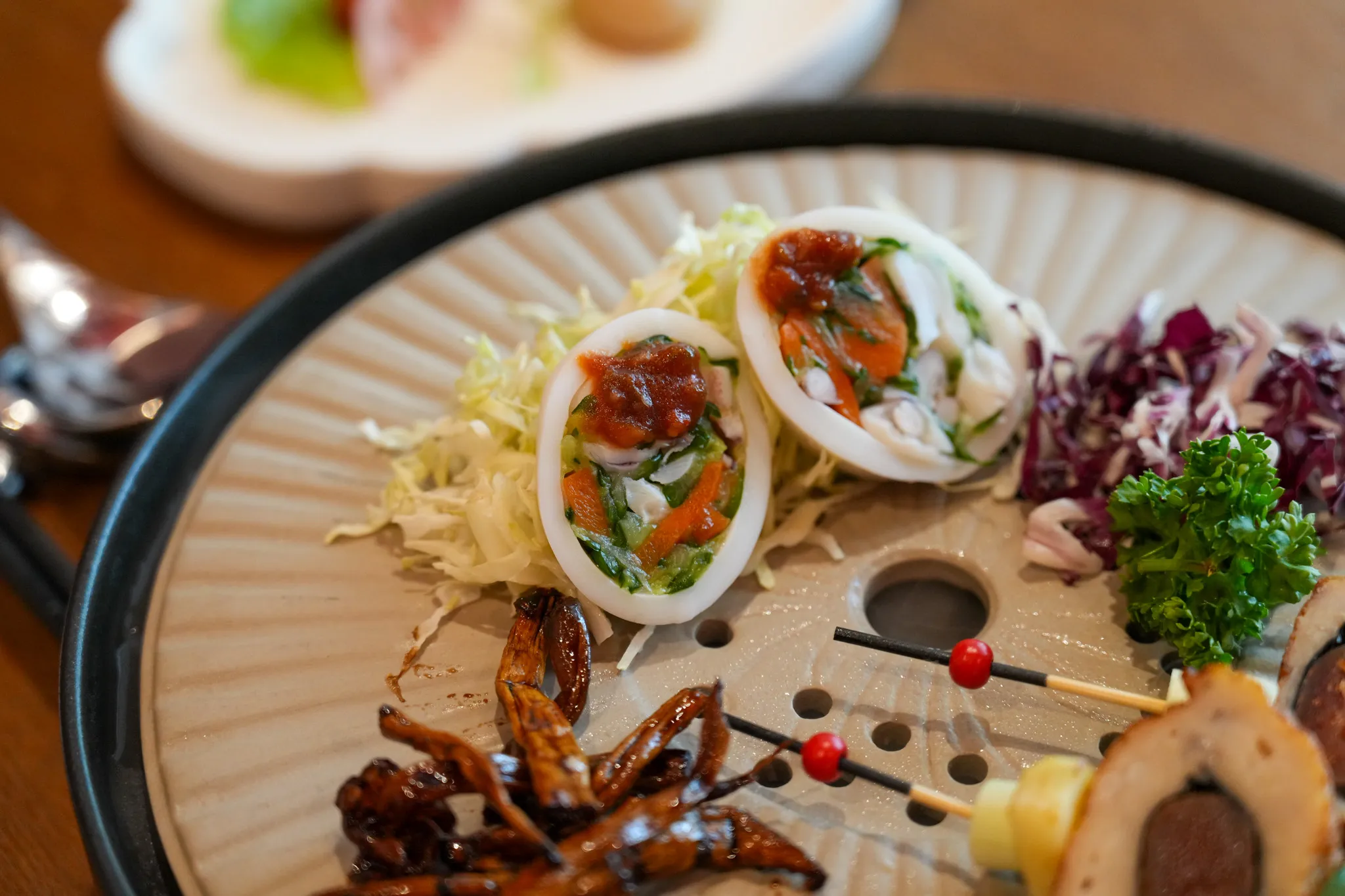 ▼用小黃瓜、花枝捲中間夾烏魚子和蘋果成串,一口咬下清爽脆口,且花枝捲中和了烏魚子的微腥,吃起來就像升級版的花枝捲,口味更有層次。