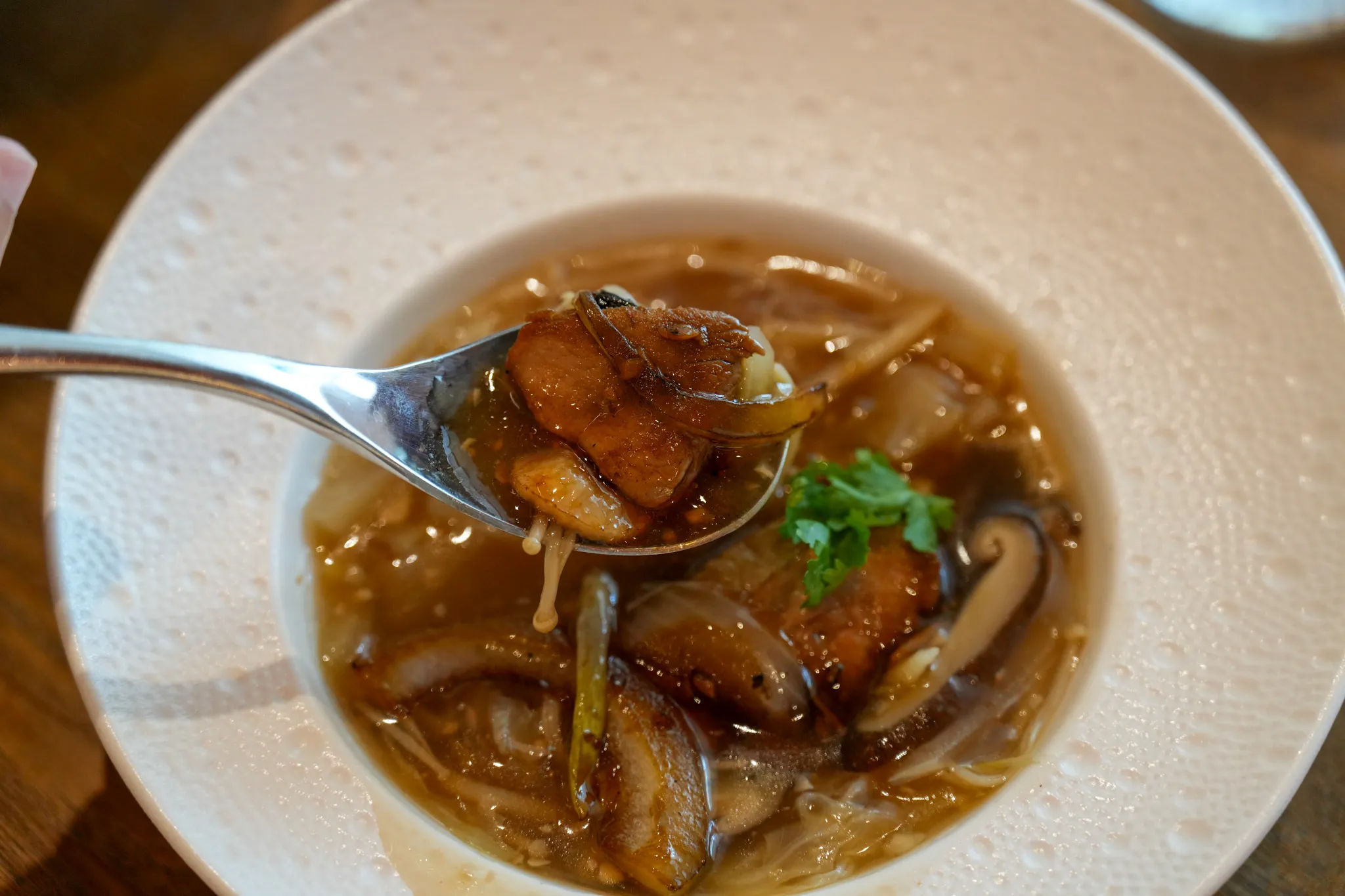 ▼佛跳牆中有栗子、鮑魚、豬肉和豬肚,湯底是使用肉骨茶加入一點花椒做提味,喝起來味道沒有很重,肉骨茶味較明顯,花椒的部分只有吃豬肚或是鮑魚這種比較吸湯汁的配料才有一點感覺,是道蠻創新的料理。
