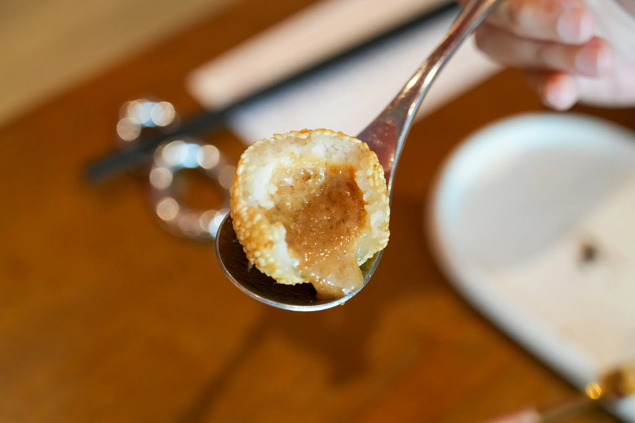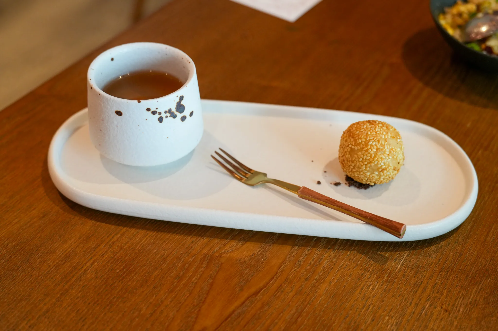 ▼這次吃到的甜品是芝麻球配上一杯青梅醋,青梅醋酸酸甜甜很解膩,芝麻球個人覺得很像是炸包餡湯圓的口感,但皮沒有那麼厚,內餡是包花生餡的,甜度適中,非常好吃!