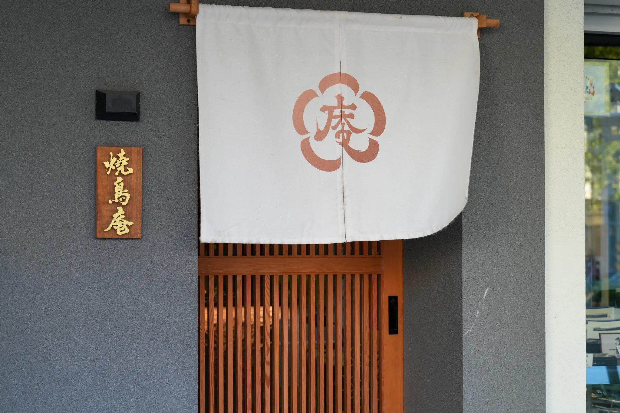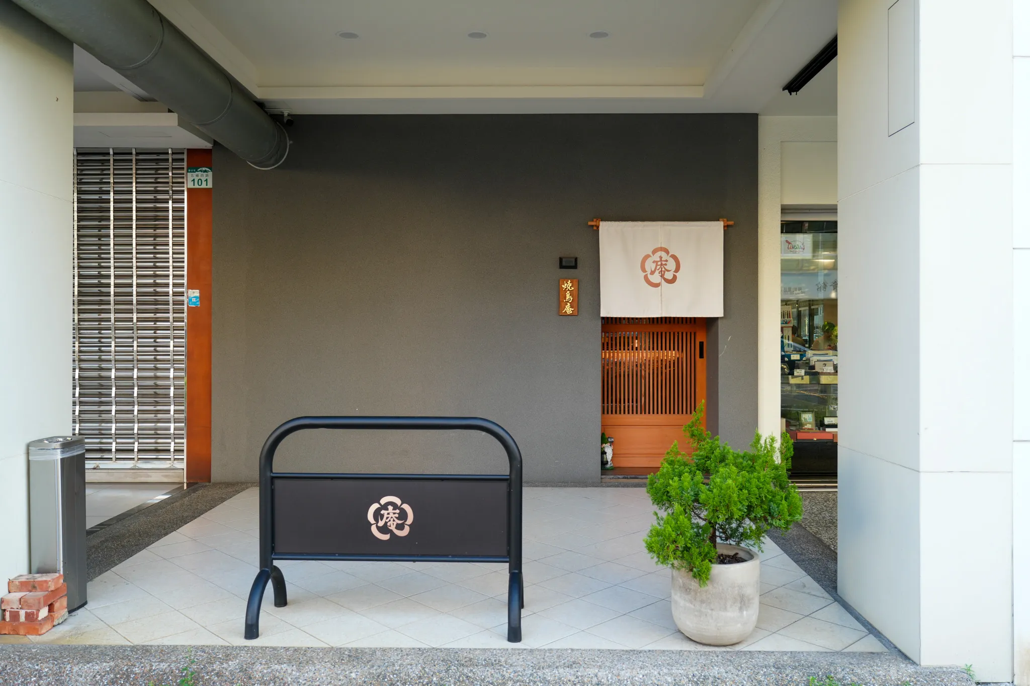 ▼「燒鳥庵」的店面十分低調,外觀以灰色牆面搭配木門,低調又帶有質感,牆面上有一個小小的木招牌,還有印上品牌LOGO的門簾,讓經過的人都忍不住多看幾眼。