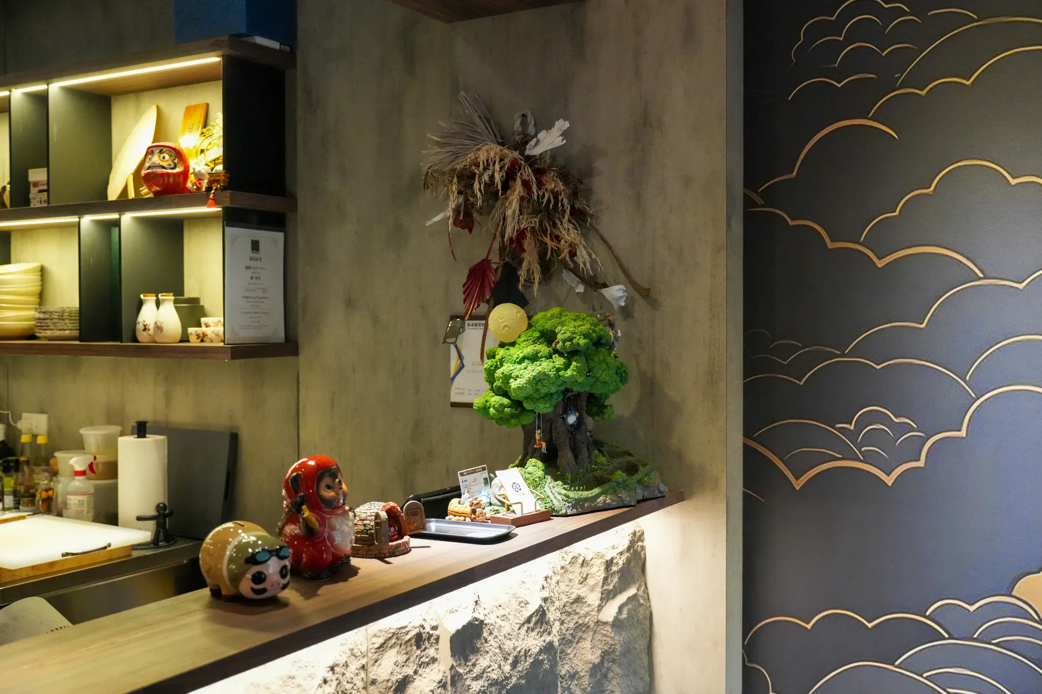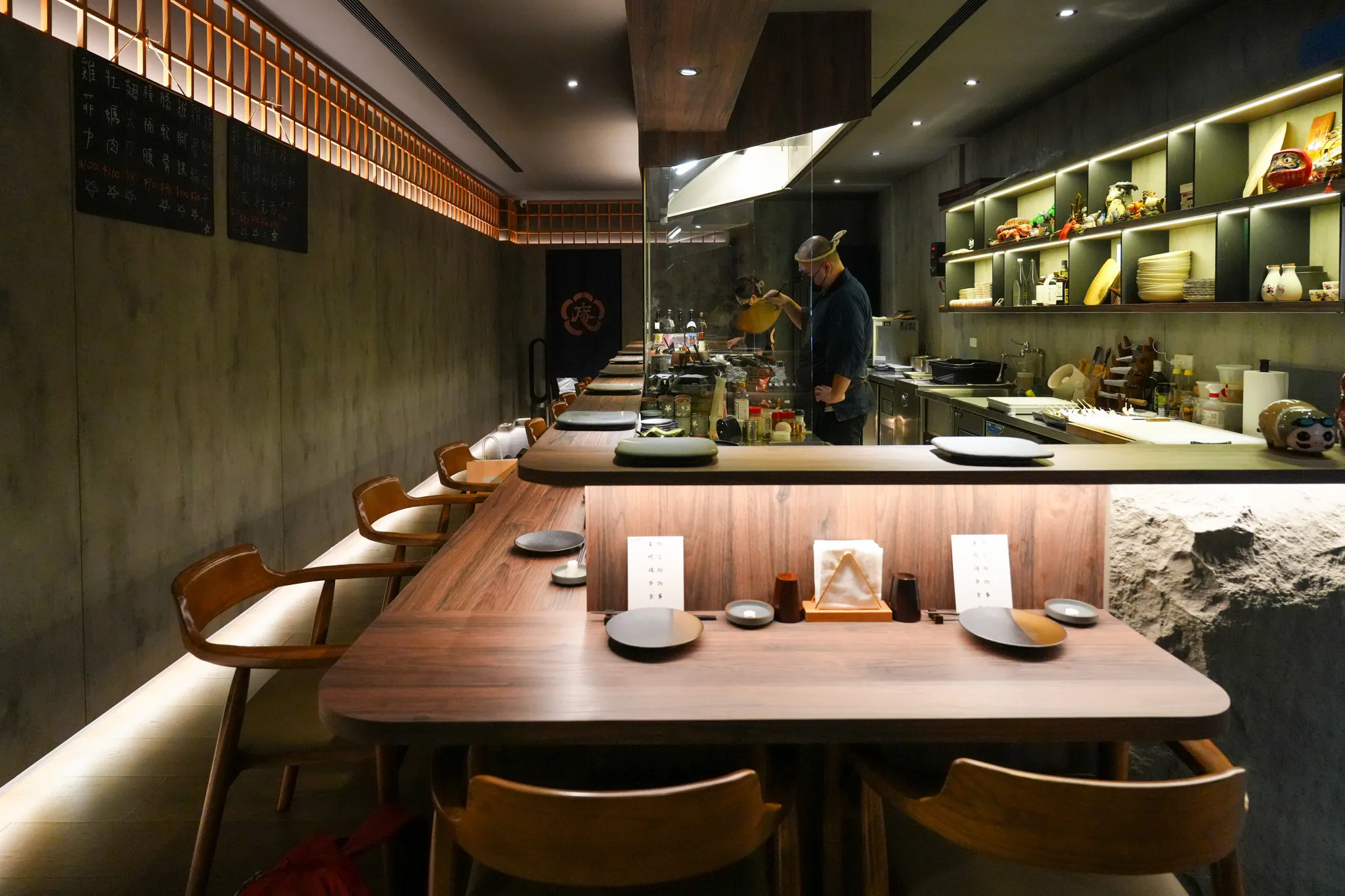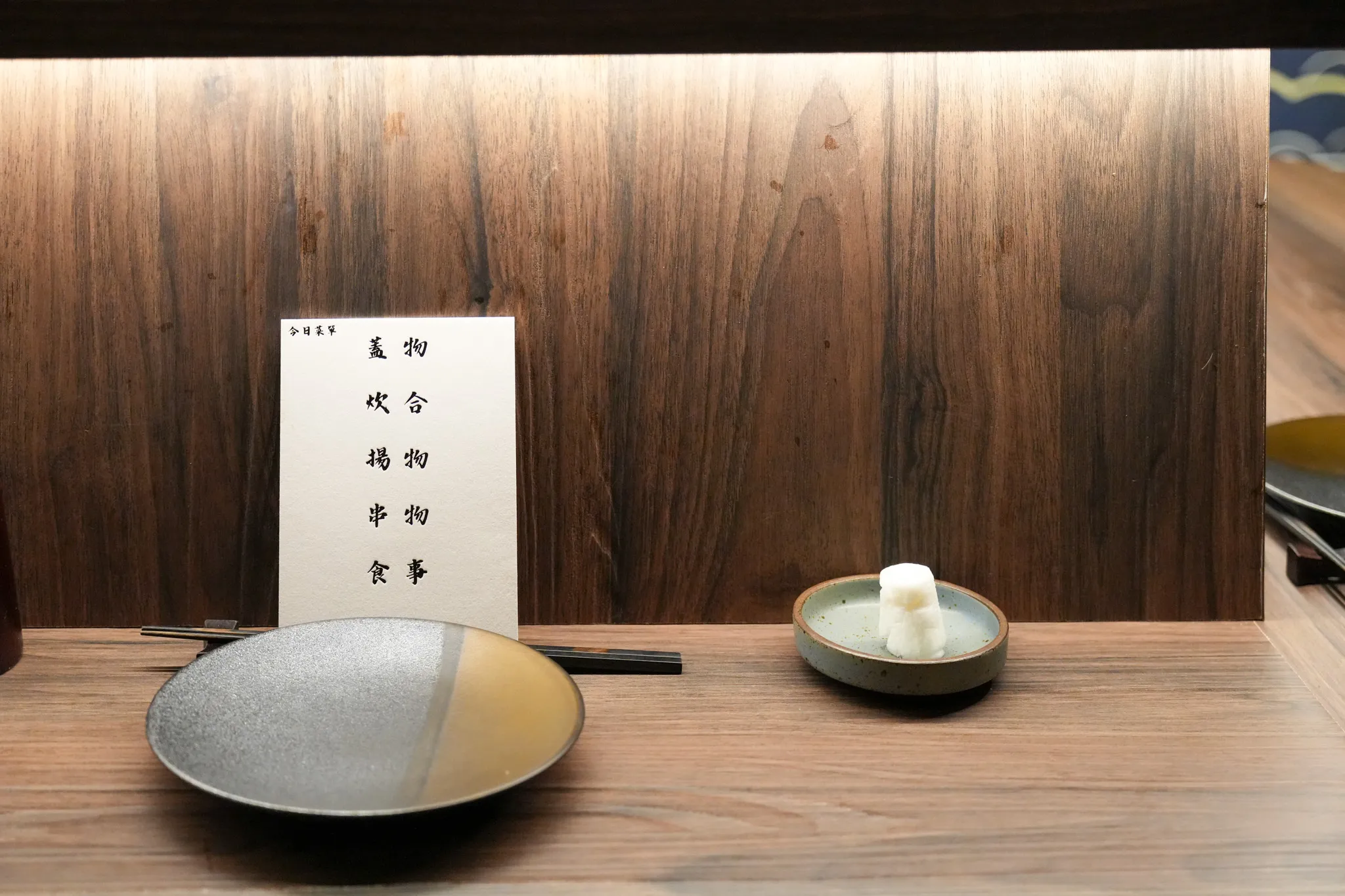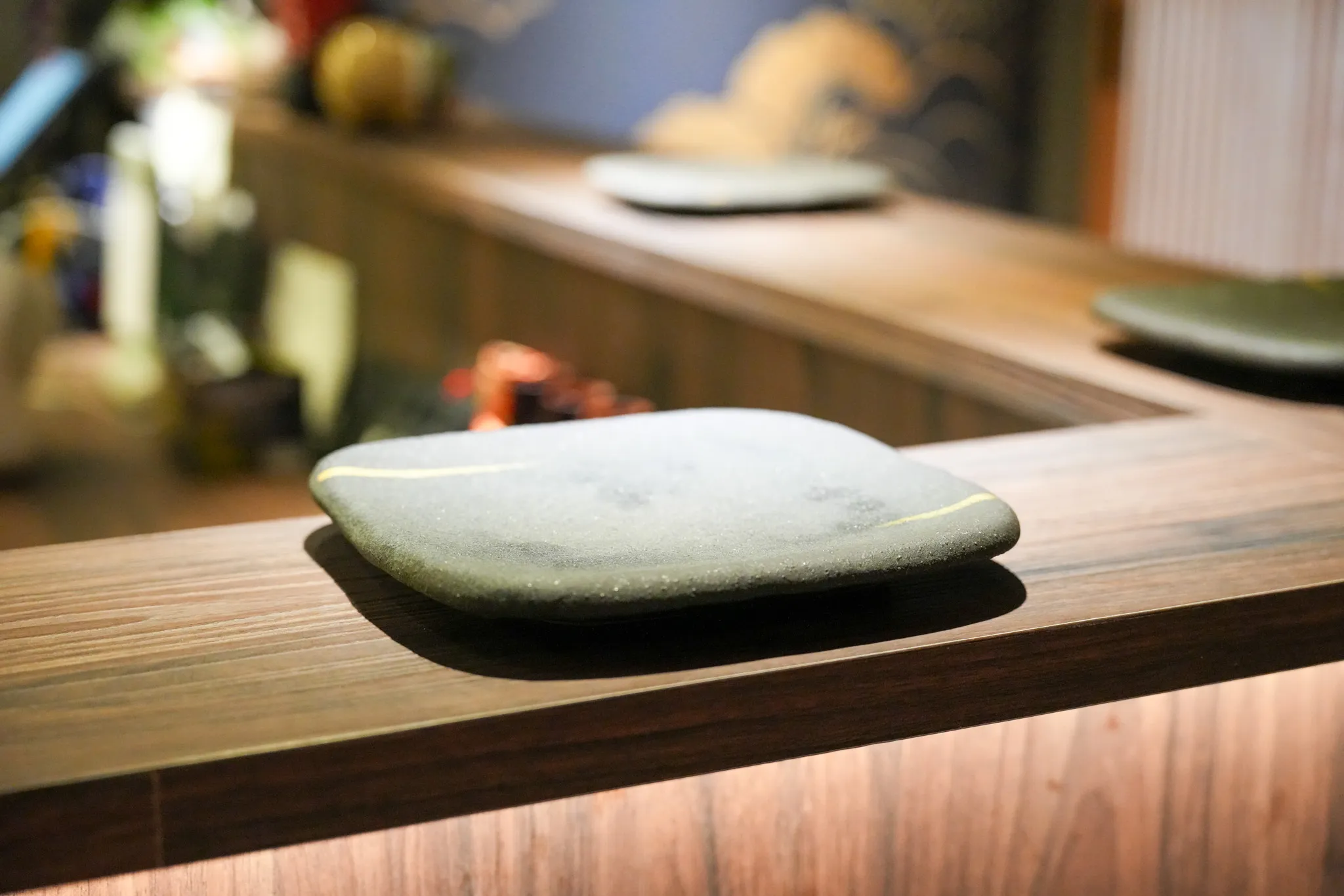 ▼推門而入,映入眼簾的是整齊劃一的板前座位,加上許多日式元素裝飾,遠遠的就看到主廚正在準備炭火和食材,也為即將到來的晚餐增添許多期待。
