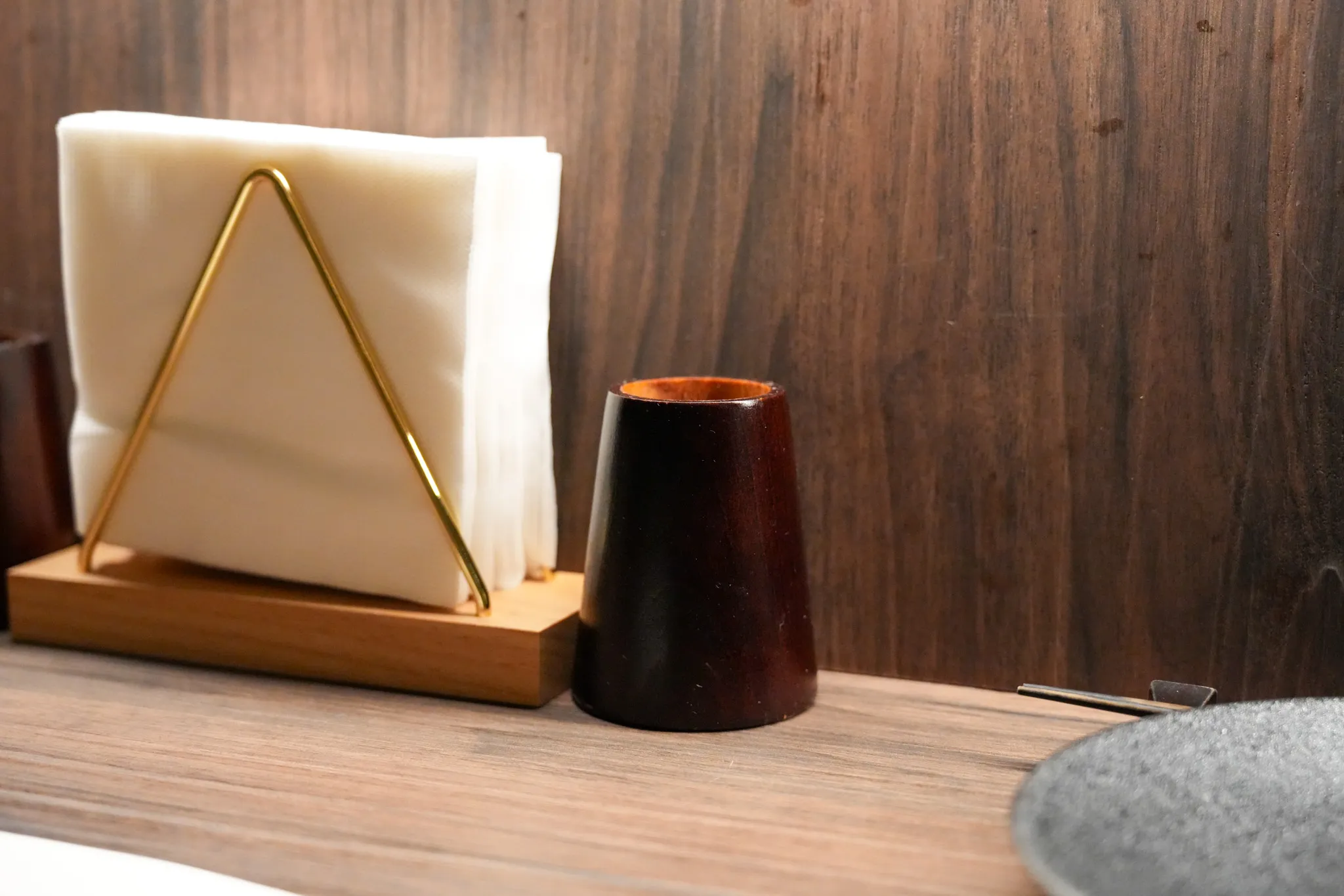 ▼桌上也有提供紙巾及放置竹籤的小籤筒,客人享用完串燒後可以直接將竹籤放入,座位前的吧台上會有一個盤子,主廚烤完一串後就可以直接放到客人面前,讓客人能直接取用。