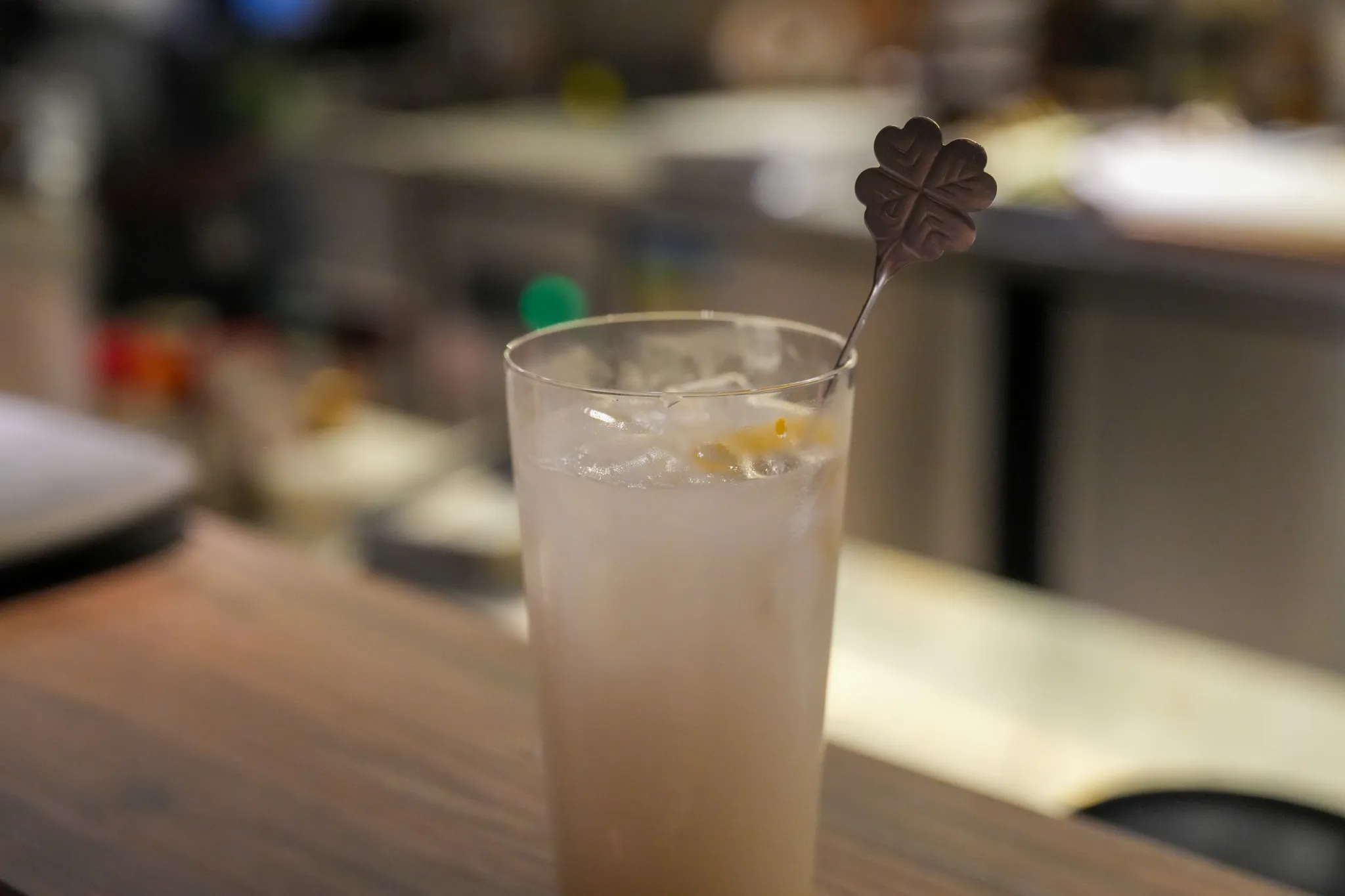 「燒鳥庵」的個人套餐總計有15道料理,用餐當日剛好遇到慶祝開店一周年的活動,每位客人的第一杯飲品都由店家贈送,所以我們各點了一杯可爾必思和一杯蜜桃酒。