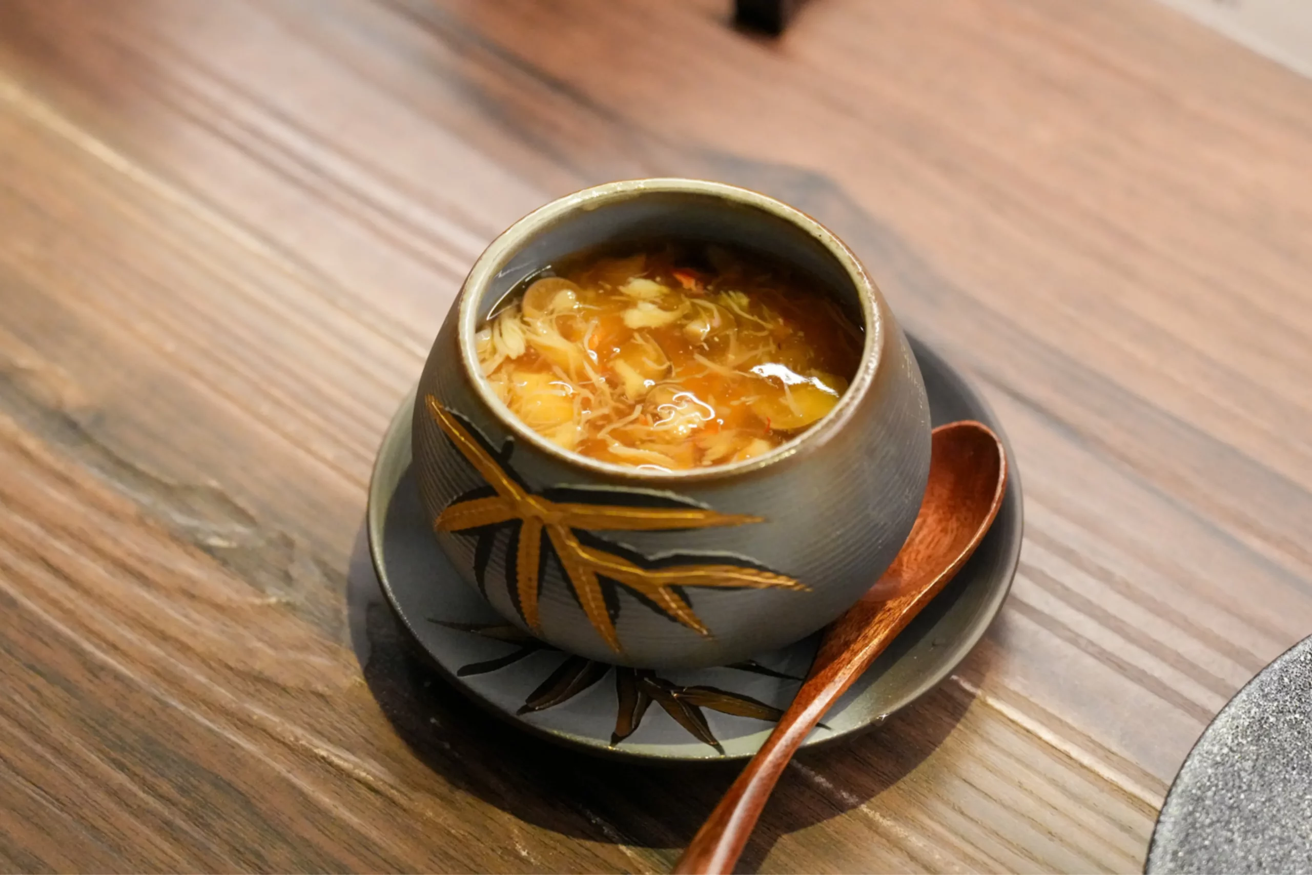 ▼上面有一層勾芡,吃起來甜甜的很清爽,蒸蛋入口即化,柳葉蟹絲的能吃到鮮甜滋味,還有搭配一些菇類,讓整體的口感更加豐富,是整個套餐中口味較清淡的料理。