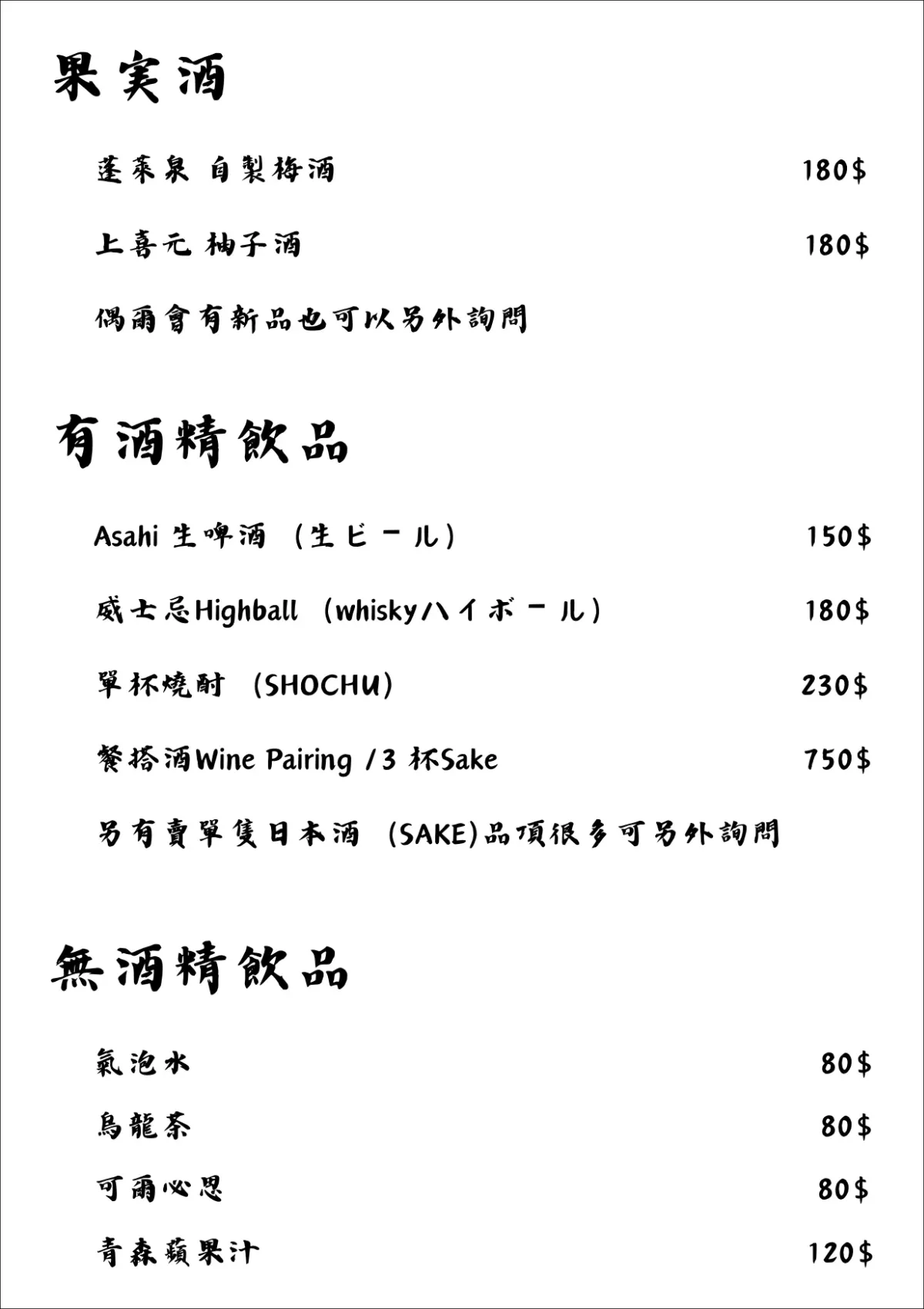 ▼「燒鳥庵」主要提供無菜單燒鳥料理,菜單內容會依時令有所不同,因此沒有固定的菜單,只有固定的酒水菜單,以下為簡單的酒水價目,提供給大家參考。