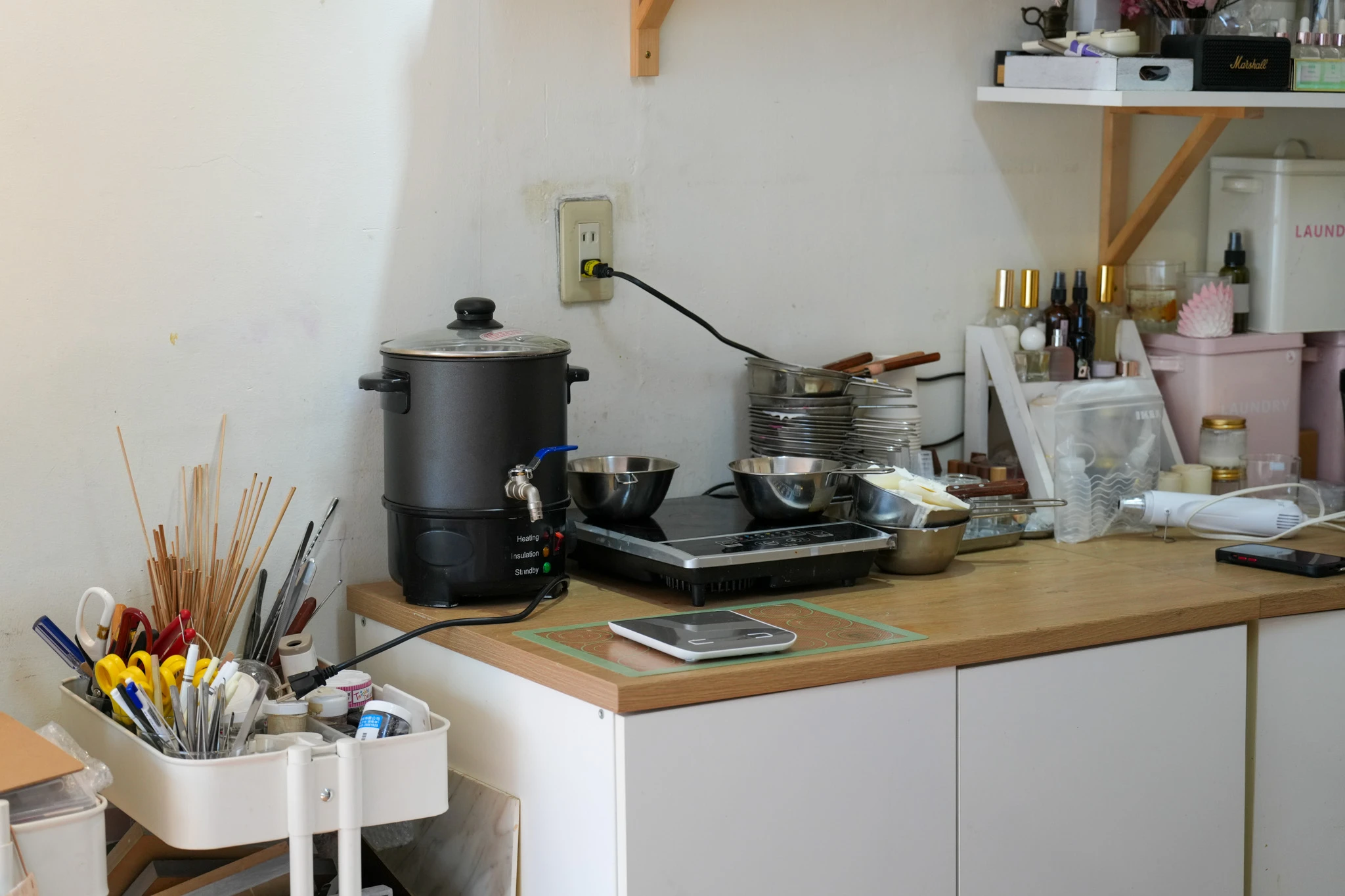 ▼左右兩側則分別擺放著手作蠟燭會用到的融蠟器具及調香用的香精。