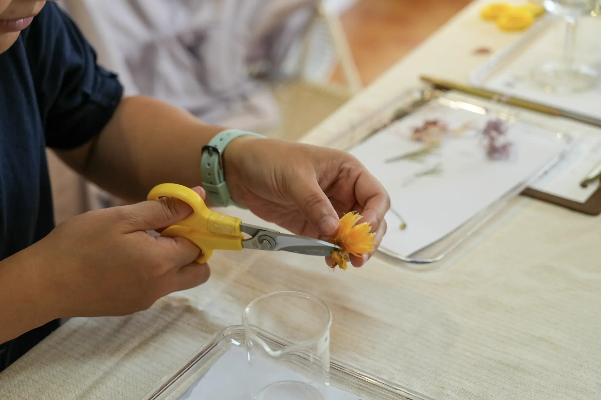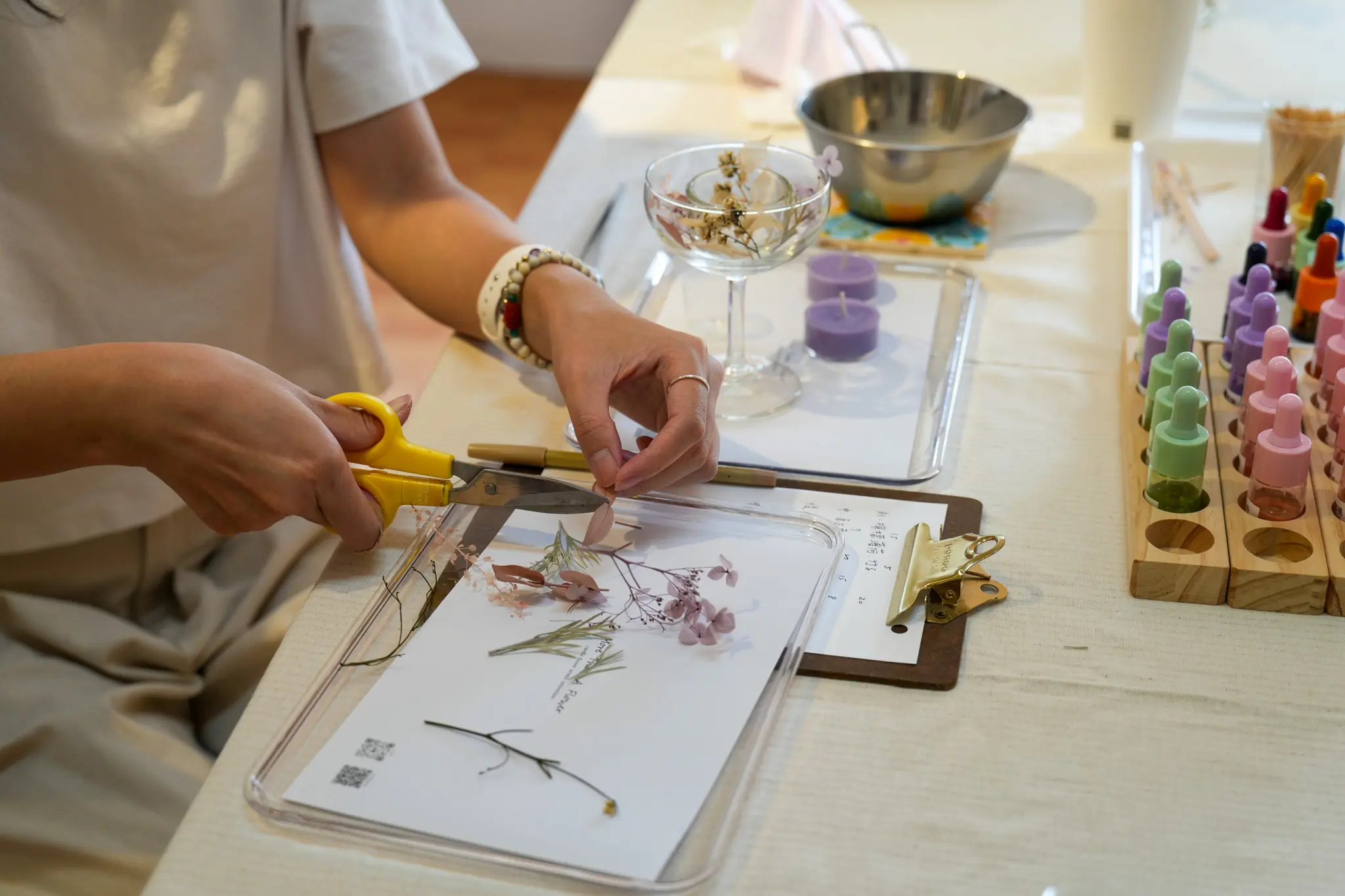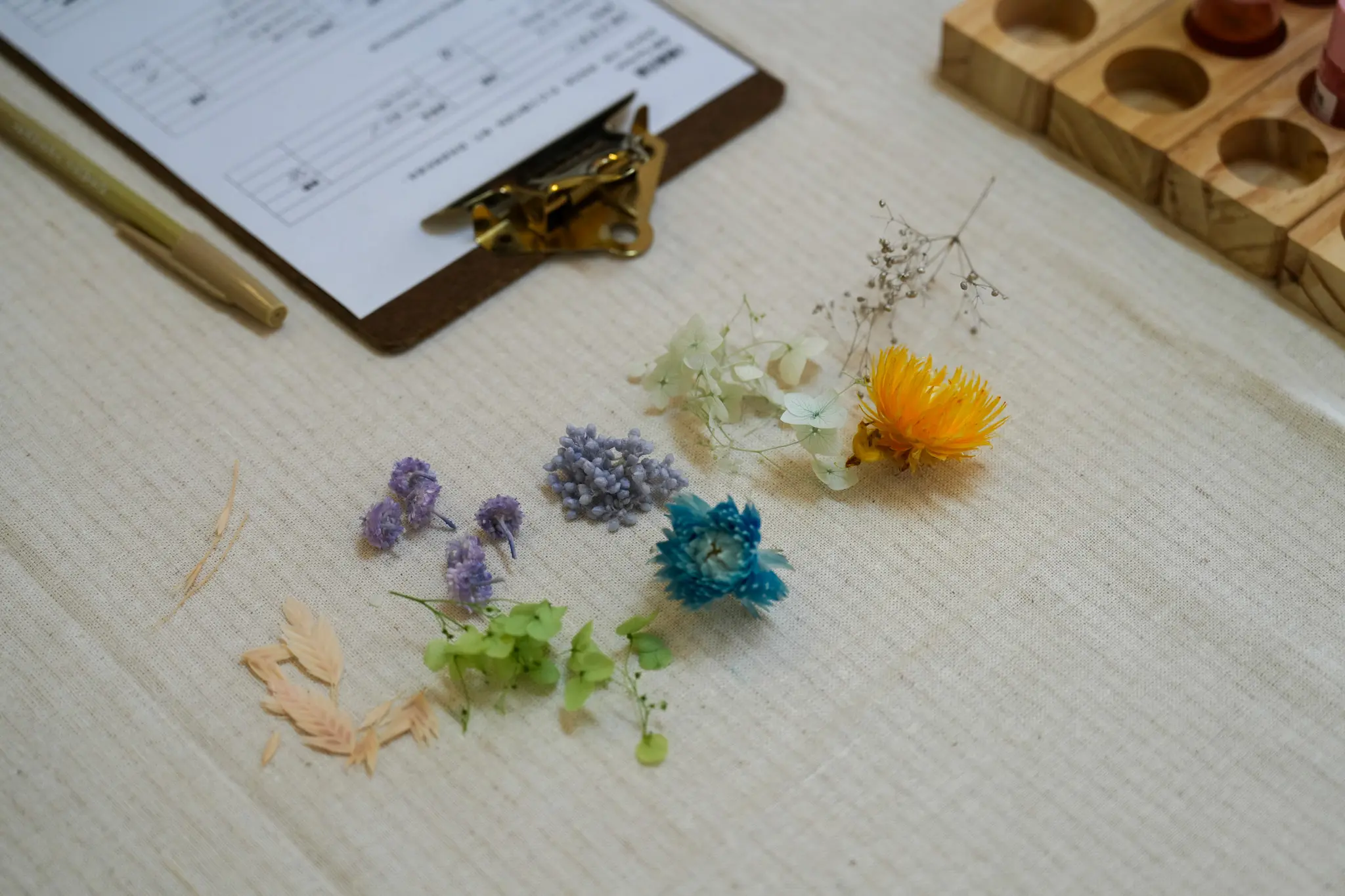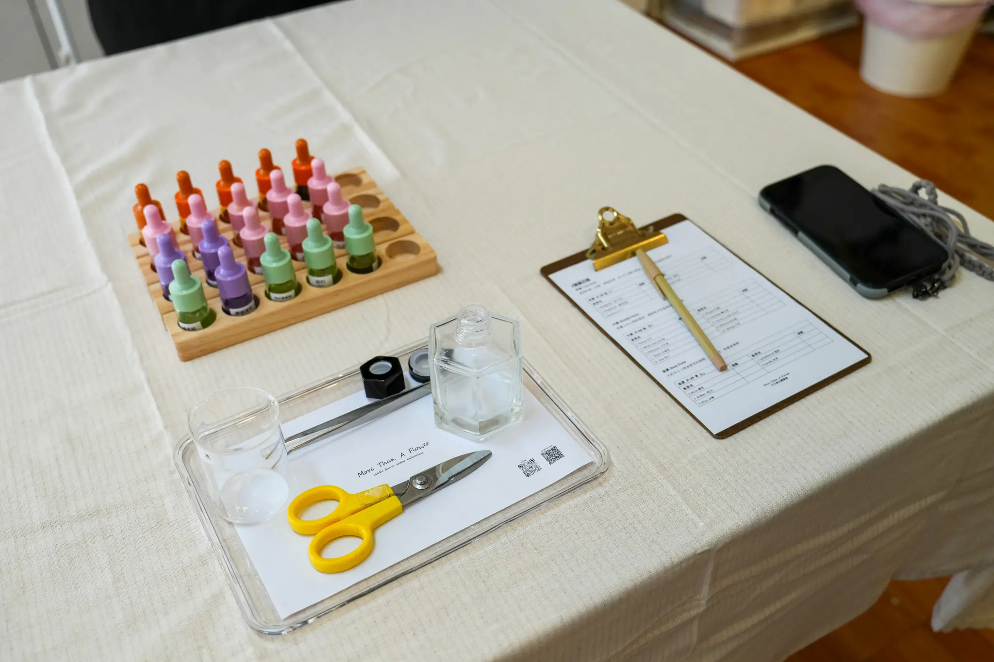 ▼這次朋友選擇的是「永生花擴香瓶」體驗課程,這項課程結合了花藝和調香的元素,課前老師會先幫忙準備好所需要用的用具。