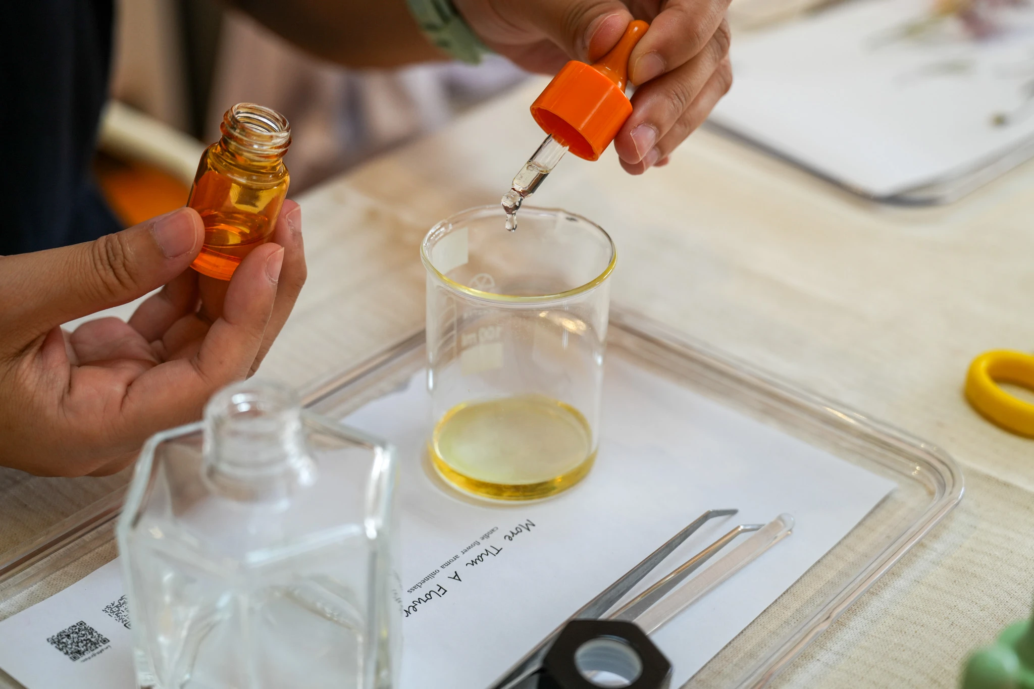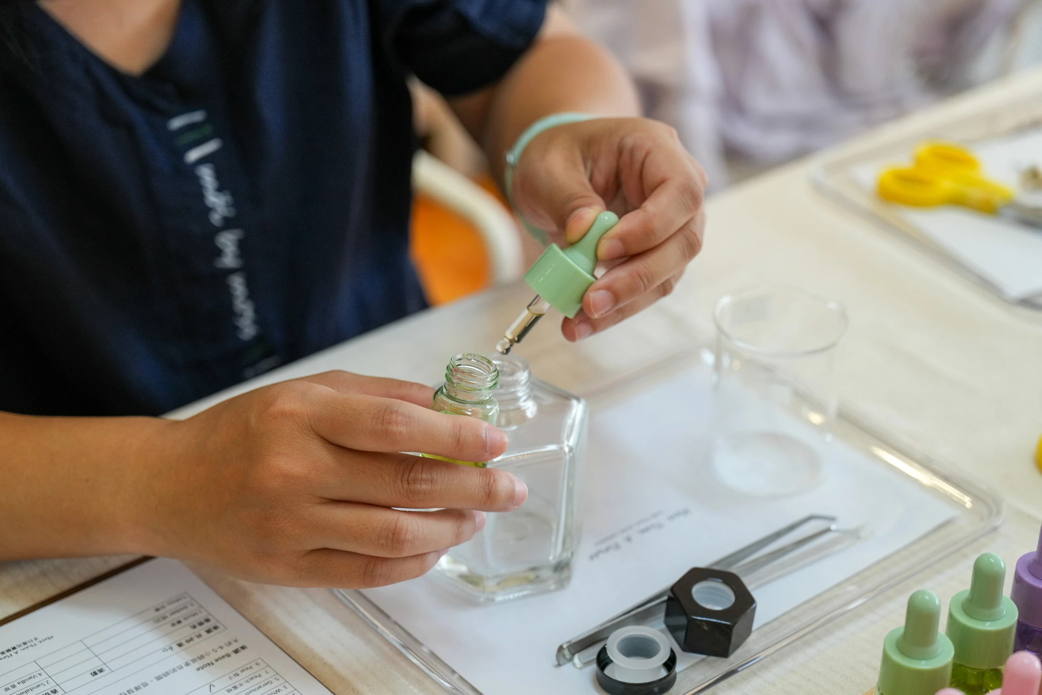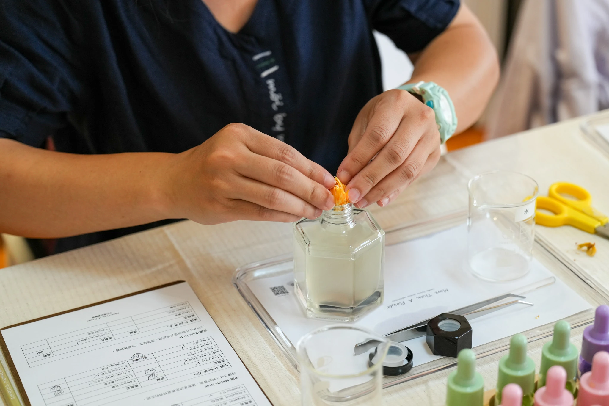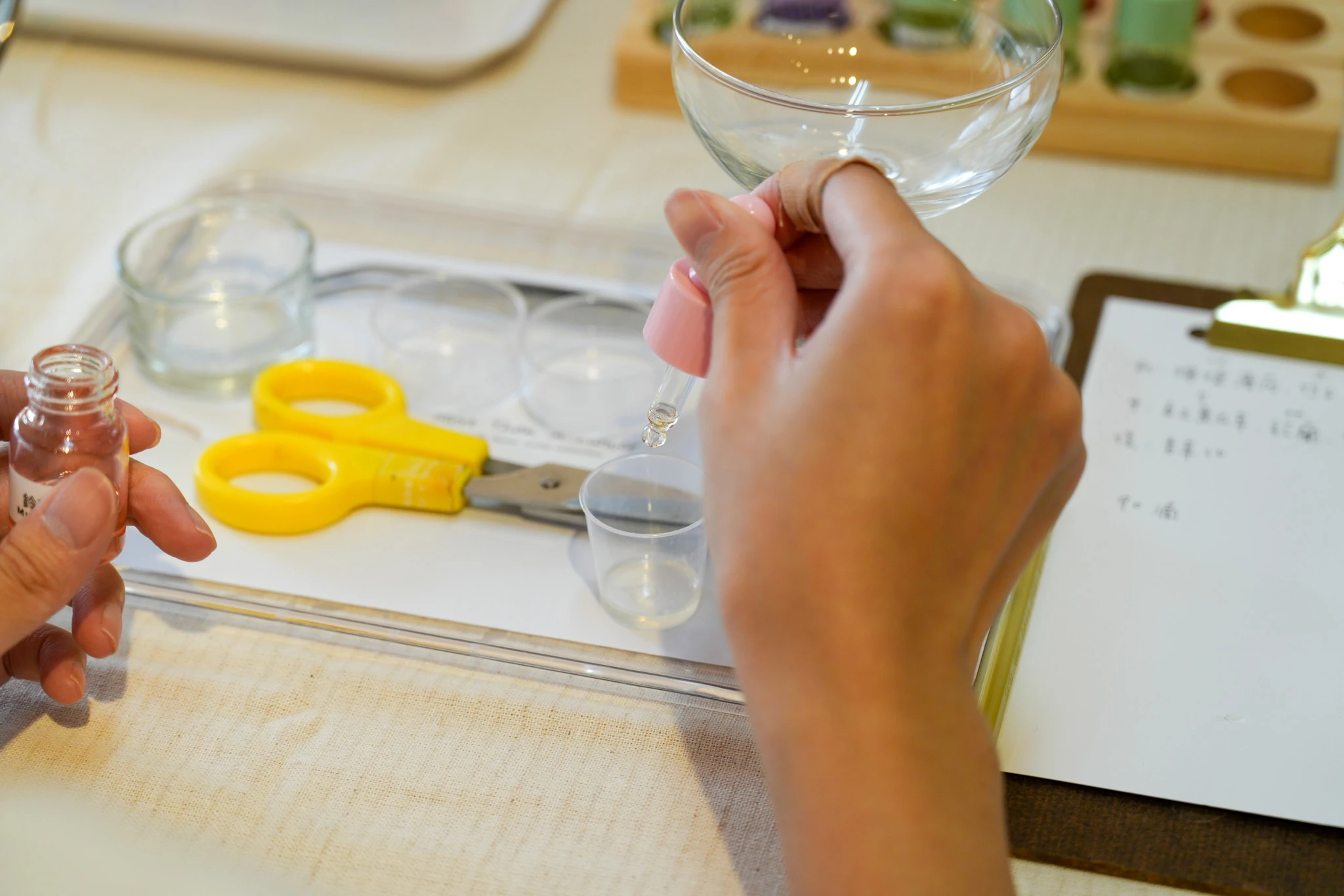 ▼接著就是調配香氣,老師會依照你所選的香氣幫你調整滴數,然後依序滴入燒杯內。
