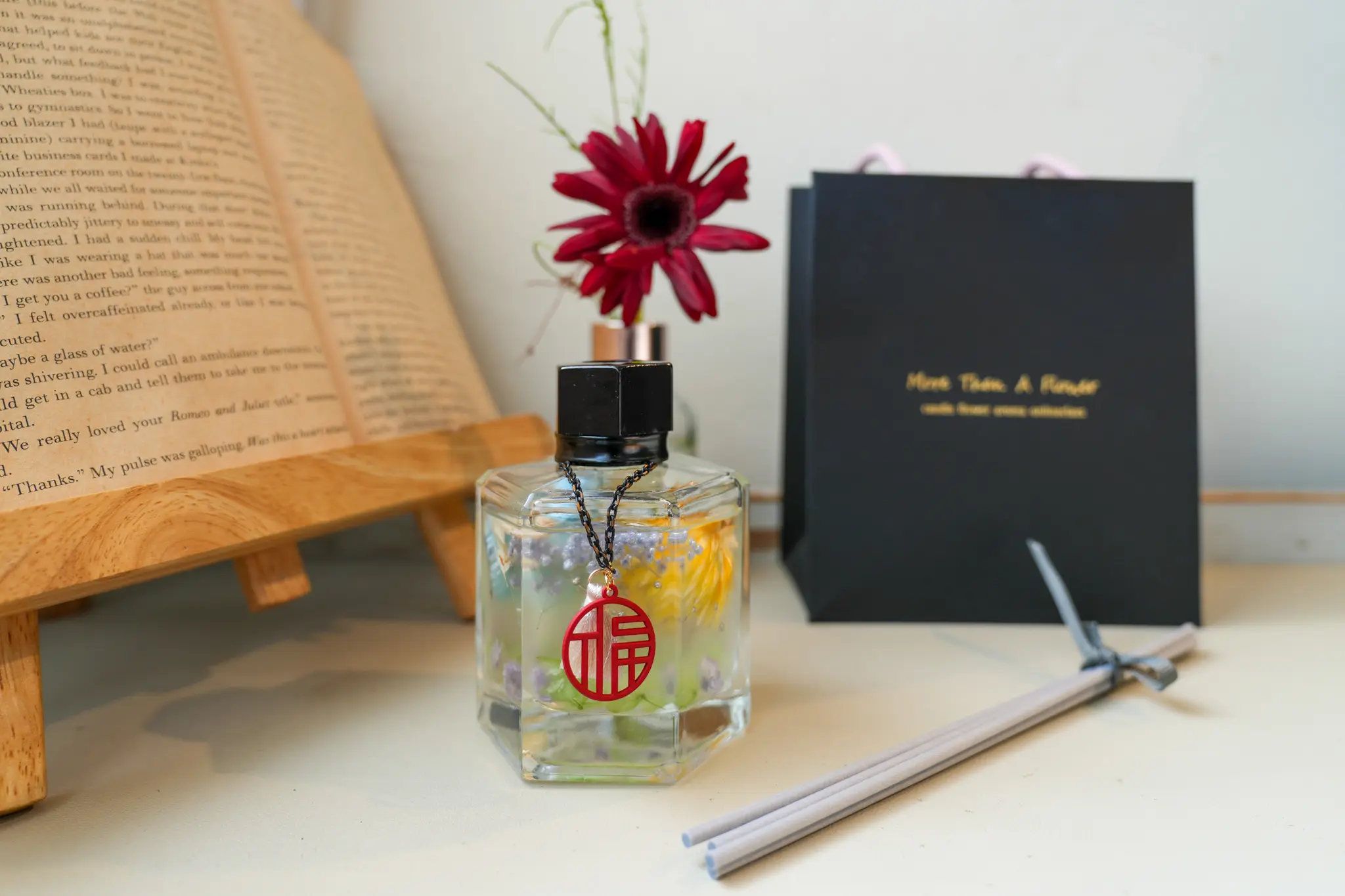▼完成後,可以把擴香瓶拿到靠窗處的小櫃子上做拍攝,拍完後會提供品牌紙袋及擴香竹,不必再額外購買,十分貼心。