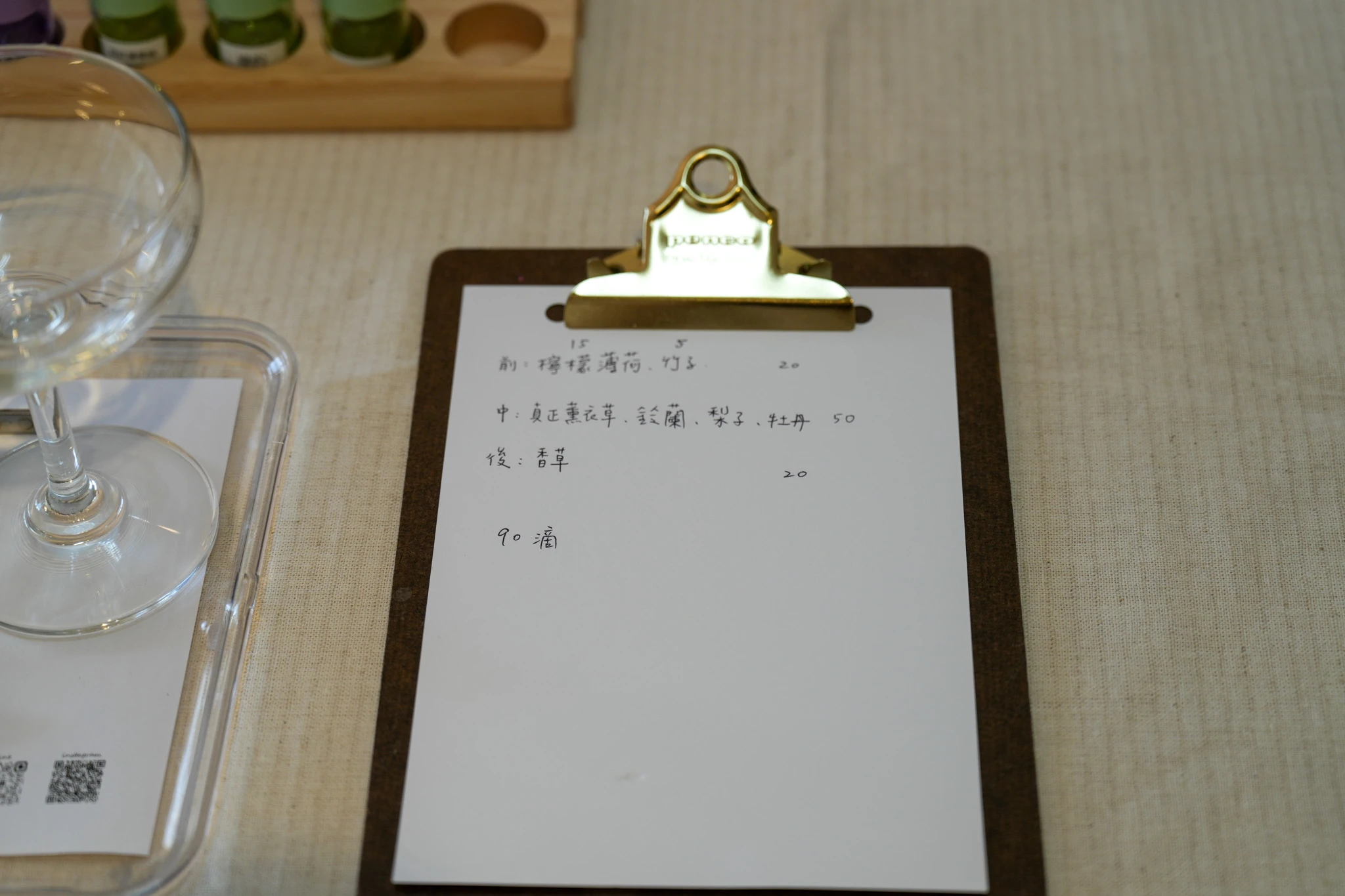 ▼旁邊還有一張學習單,上面有這次聞香的香味名稱,也有幫你分好前、中、後調,讓你可以記錄自己選擇了哪些香味。