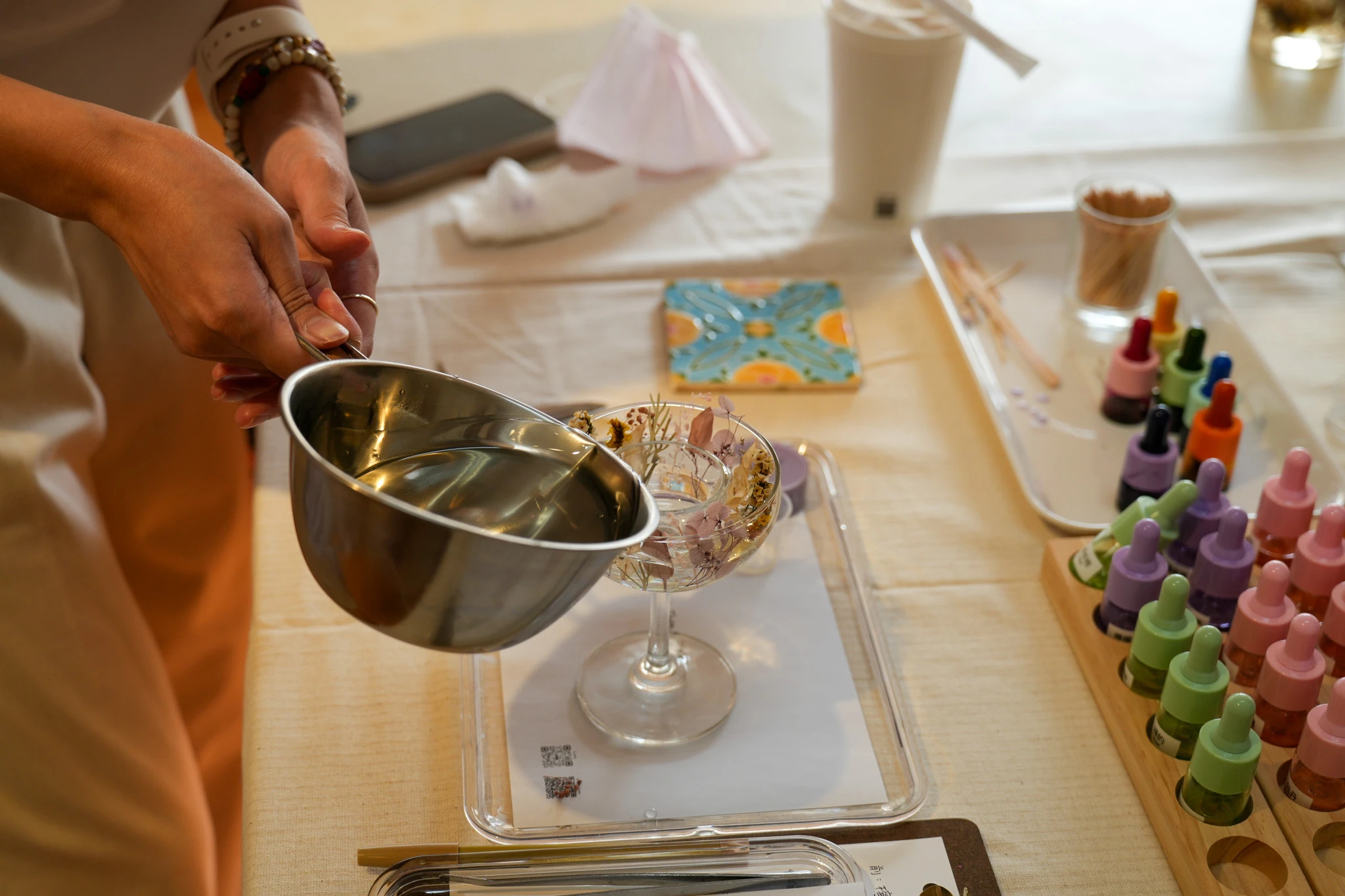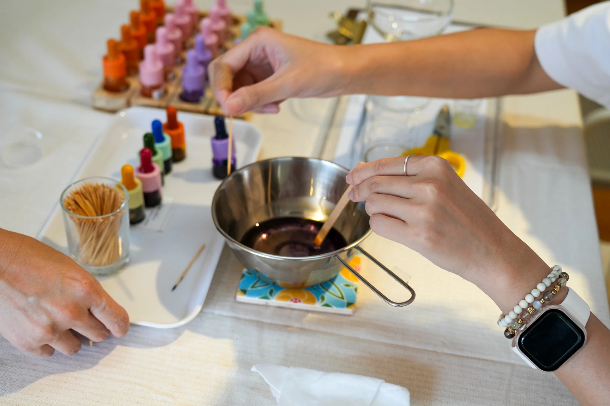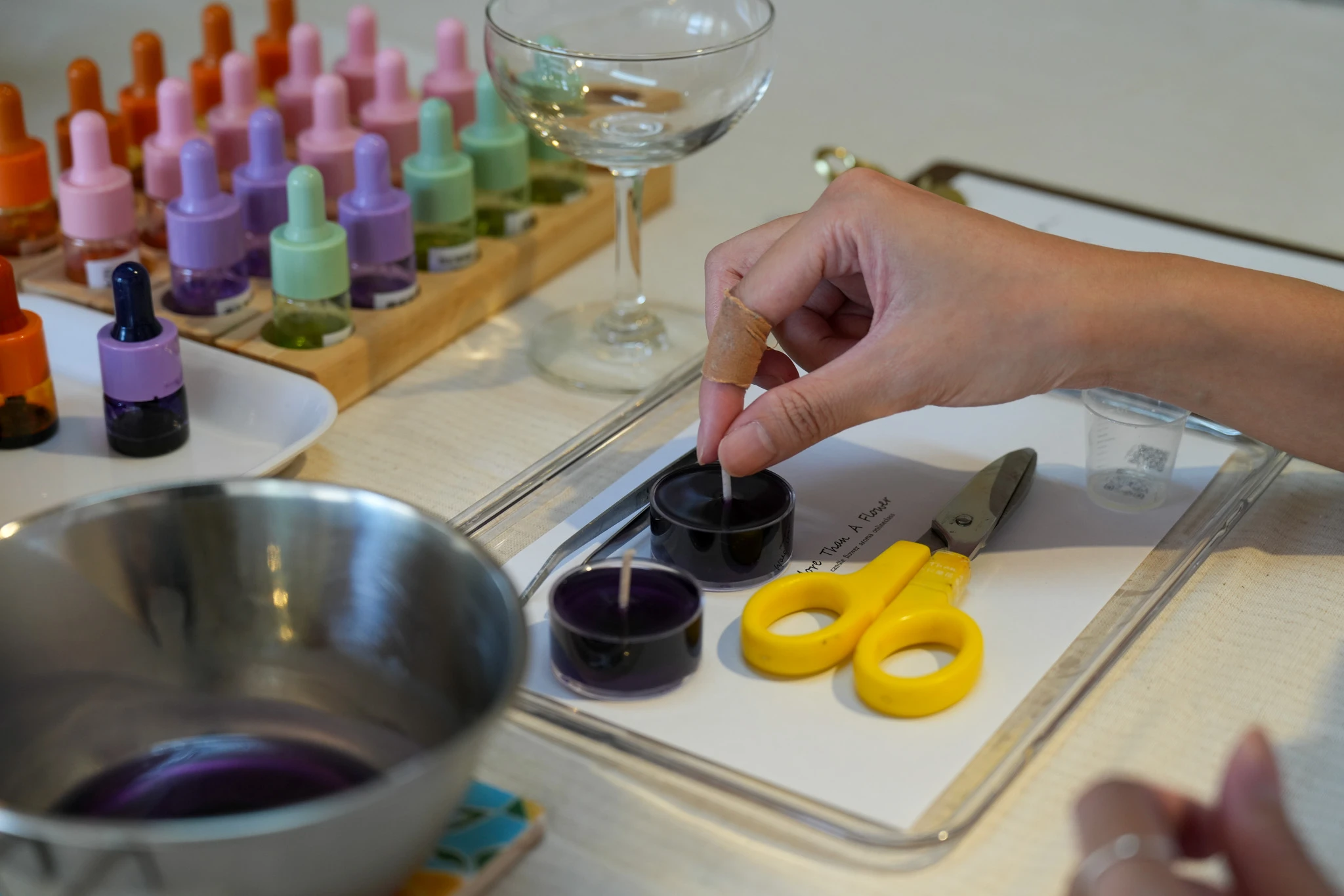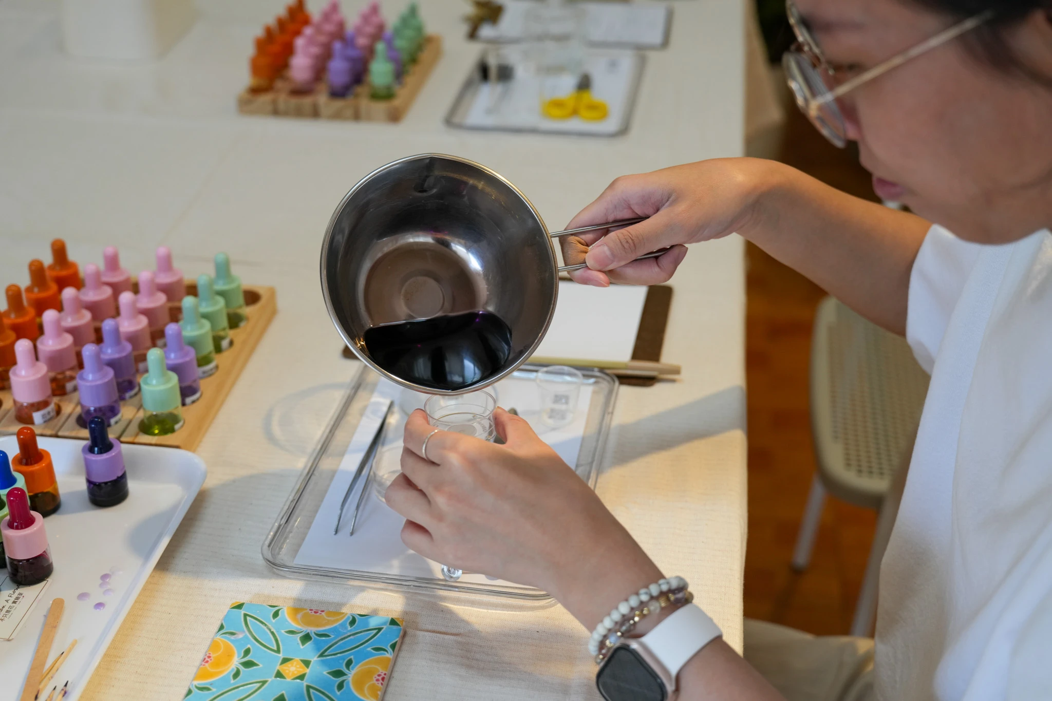 ▼確定顏色沒問題後,老師會再度把蠟燭溶液加熱到完全融化,讓你倒入小茶蠟的容器中,接著請你放上燭芯。