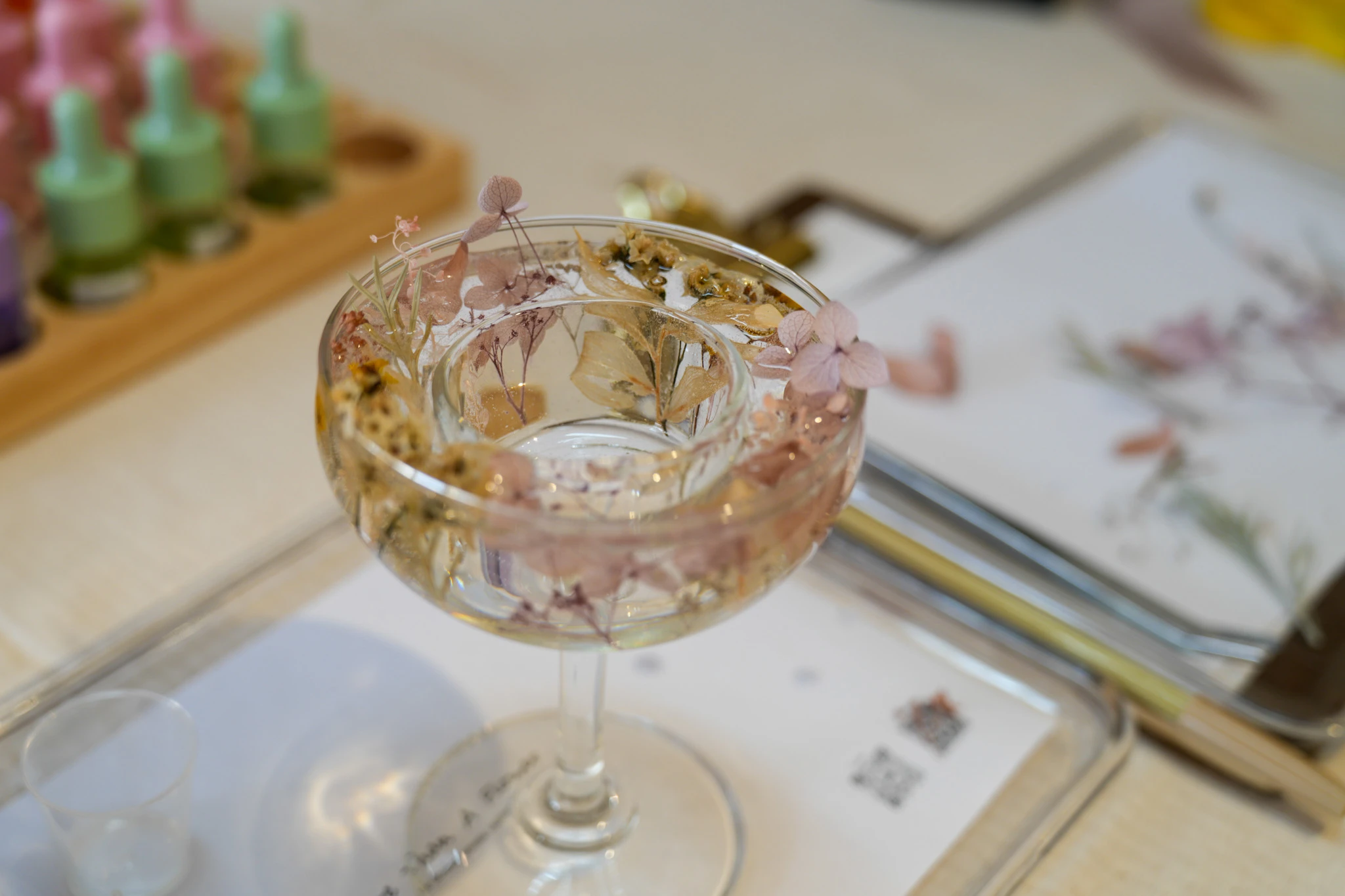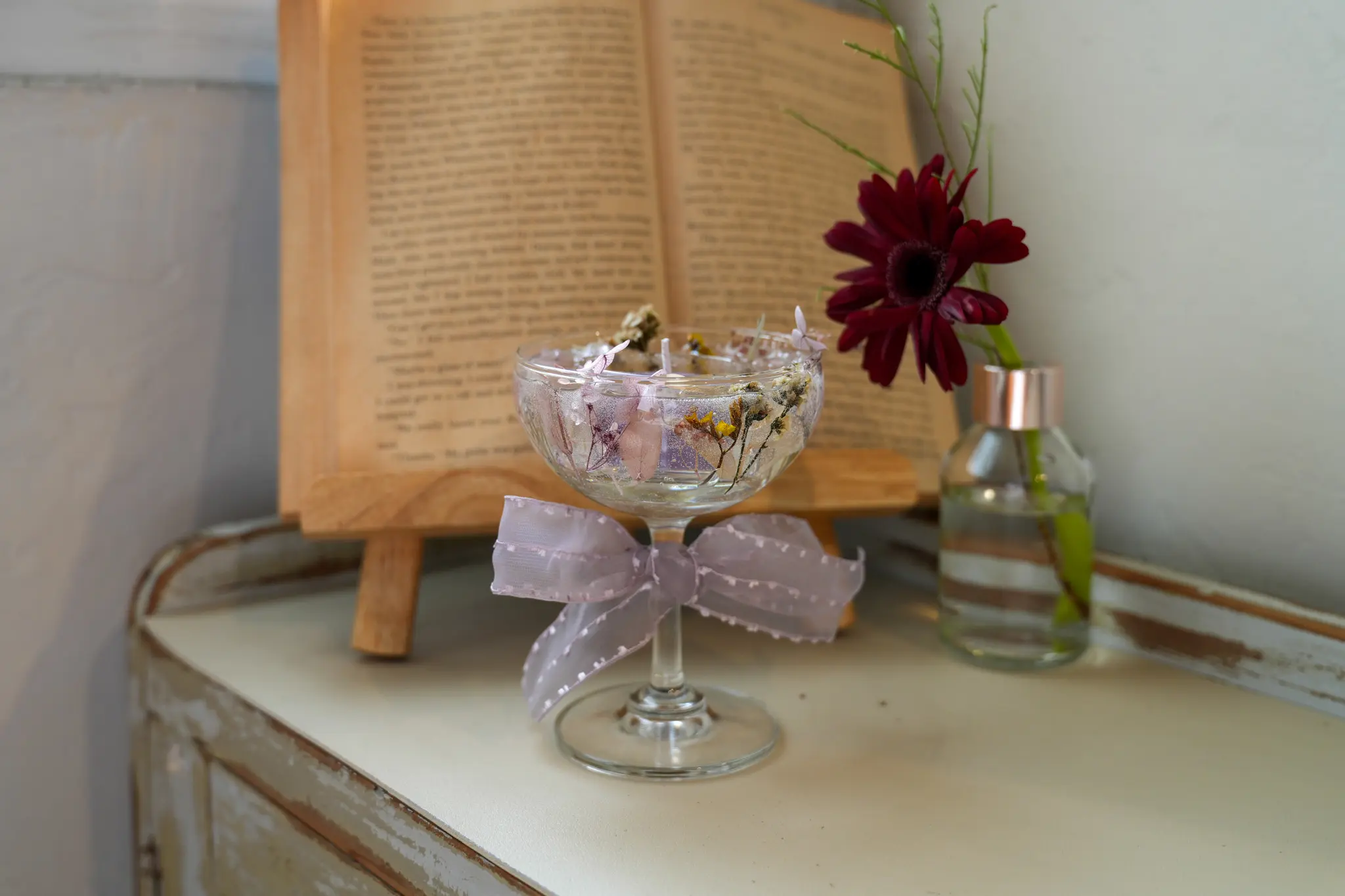 ▼花材擺放好後,可以稍微旋轉一下高腳杯看看是否有哪裡太空或是太緊密想要調整,確認無誤後,在外圍倒入透明的果凍蠟做固定,漂亮的水晶燭台就完成啦!