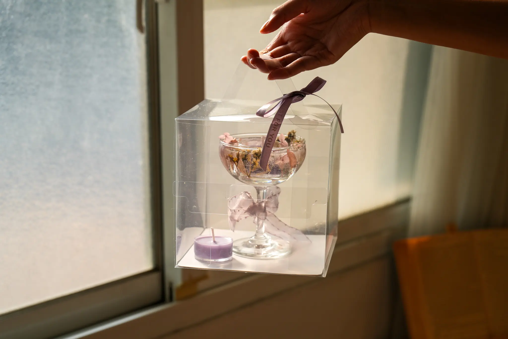 ▼最後會幫你用透明的盒子裝起來,不過由於果凍蠟是最後才倒入,在包裝時可能還沒完全凝固,所以老師有特別在燭台底部黏上萬用黏土做固定,在拿的時候也要小心避免傾倒,讓果凍蠟溢出來。
