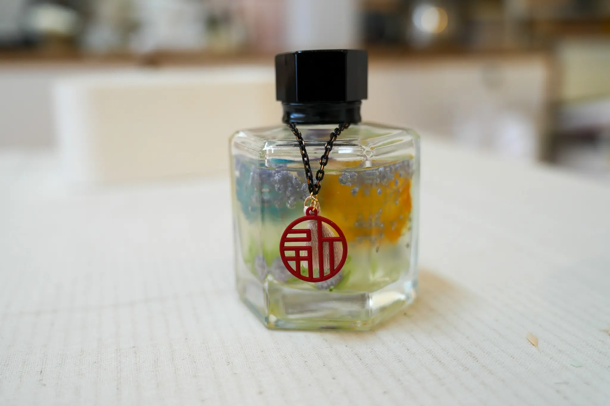 ▼將所選的花材一一投入瓶中後,老師就會幫你把瓶口塞入透明塞子,然後蓋上黑色的外蓋,最後還會請你選擇一個小掛飾可以掛在瓶口,療癒的擴香瓶就完成啦!