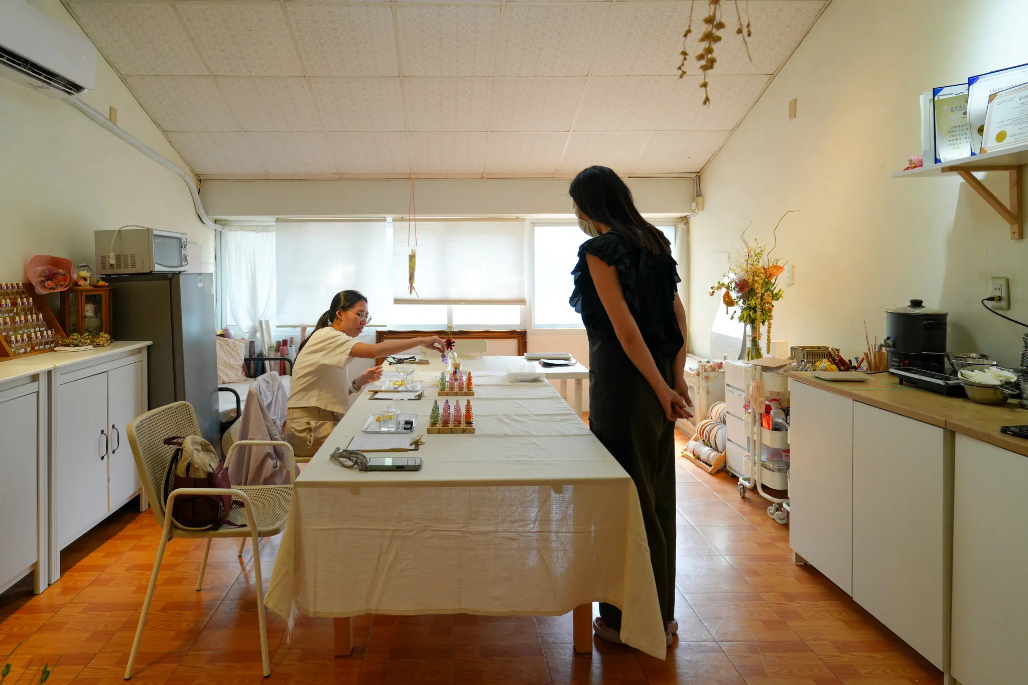 「不只是花實驗室」隱身在高雄地方法院對面的咖啡店二樓,教室空間寬敞舒適,一入內就能看到漂亮的花材及擺放整齊的蠟燭工具,旁邊整排的窗戶能讓午後陽光灑入,讓整個上課空間更加明亮舒適。由於老師只有一人上課,所以如果是跟我們一樣兩人操作不同的項目,過程中可能多少還是會有需要互等的時候,但大多數時間都是兩項課程同時進行。