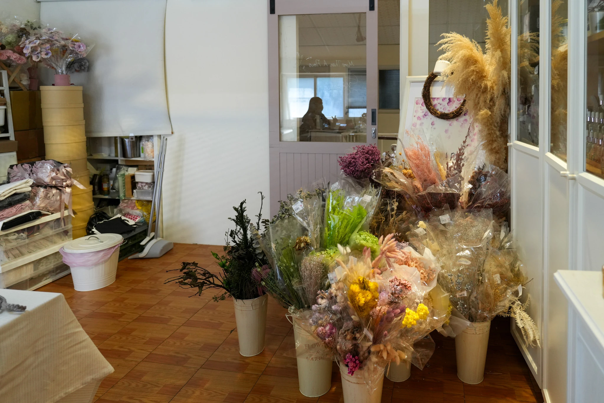 ▼上樓後會看到許多花材及粉色的拉門,就像是隱身在咖啡店內的另一個小天地。