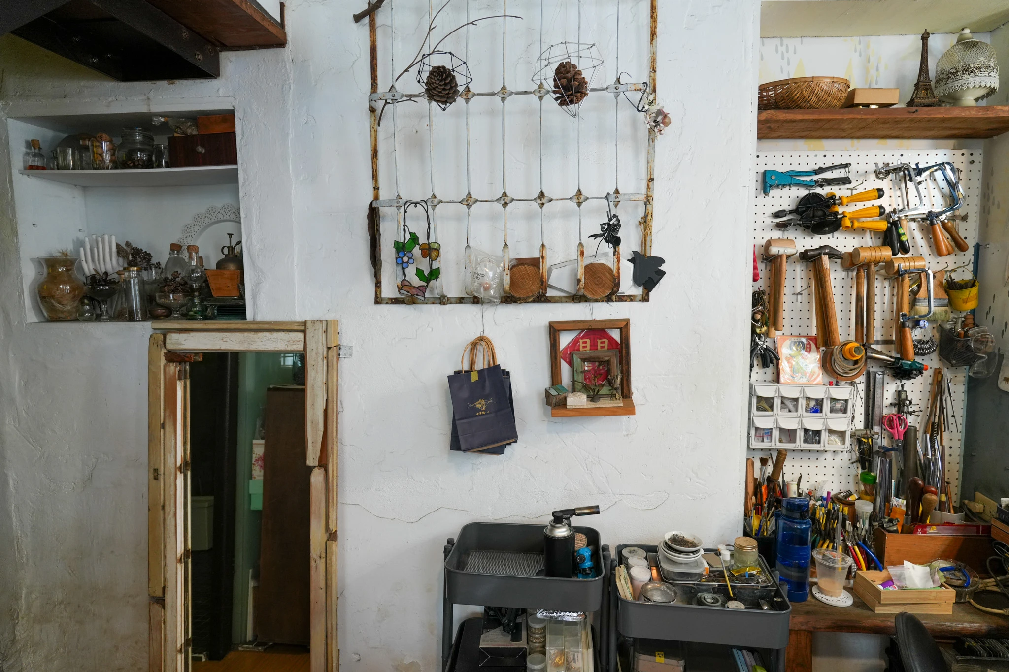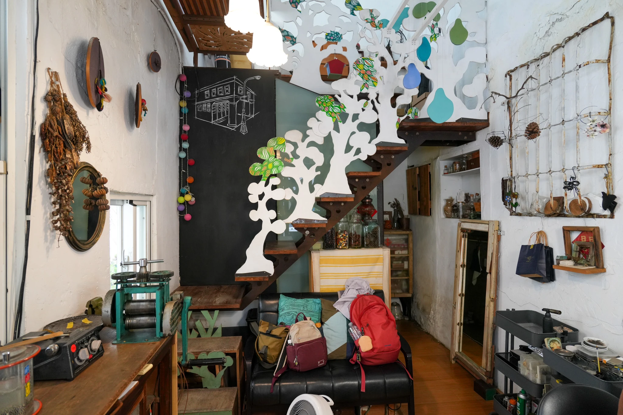 ▼走進騎樓,會看到工作室墨綠色的木門搭配白色窗框,門邊擺放著老木櫃、玻璃花瓶與植栽,小巧卻充滿生活感,透過玻璃還能隱約看見室內的溫暖光景,給人一種靜靜走進時光裡的感覺。