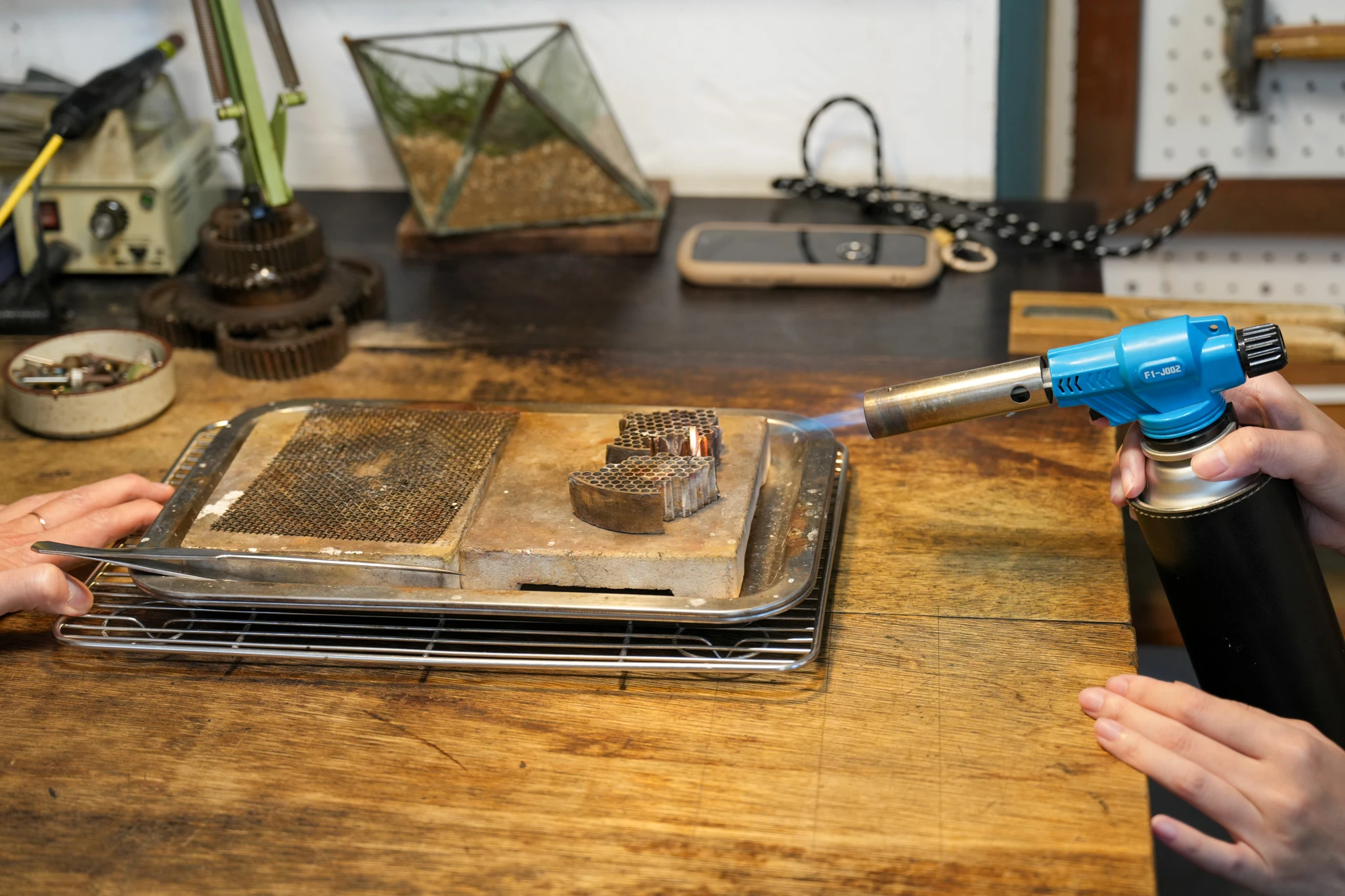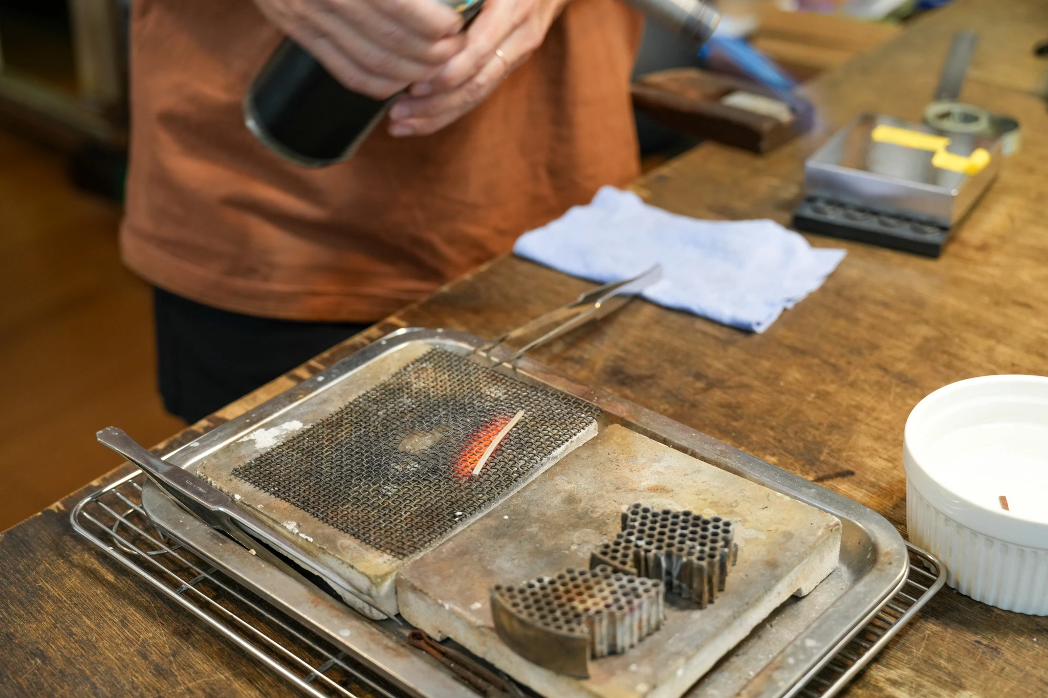 ▼老師會幫你把接口對好,然後請你塗上助焊劑並放上焊片,最後開火將其融化銲接,其中「小洋樓」所使用火槍體積較大,所以需要和戒指保持一定的距離,避免溫度太高。