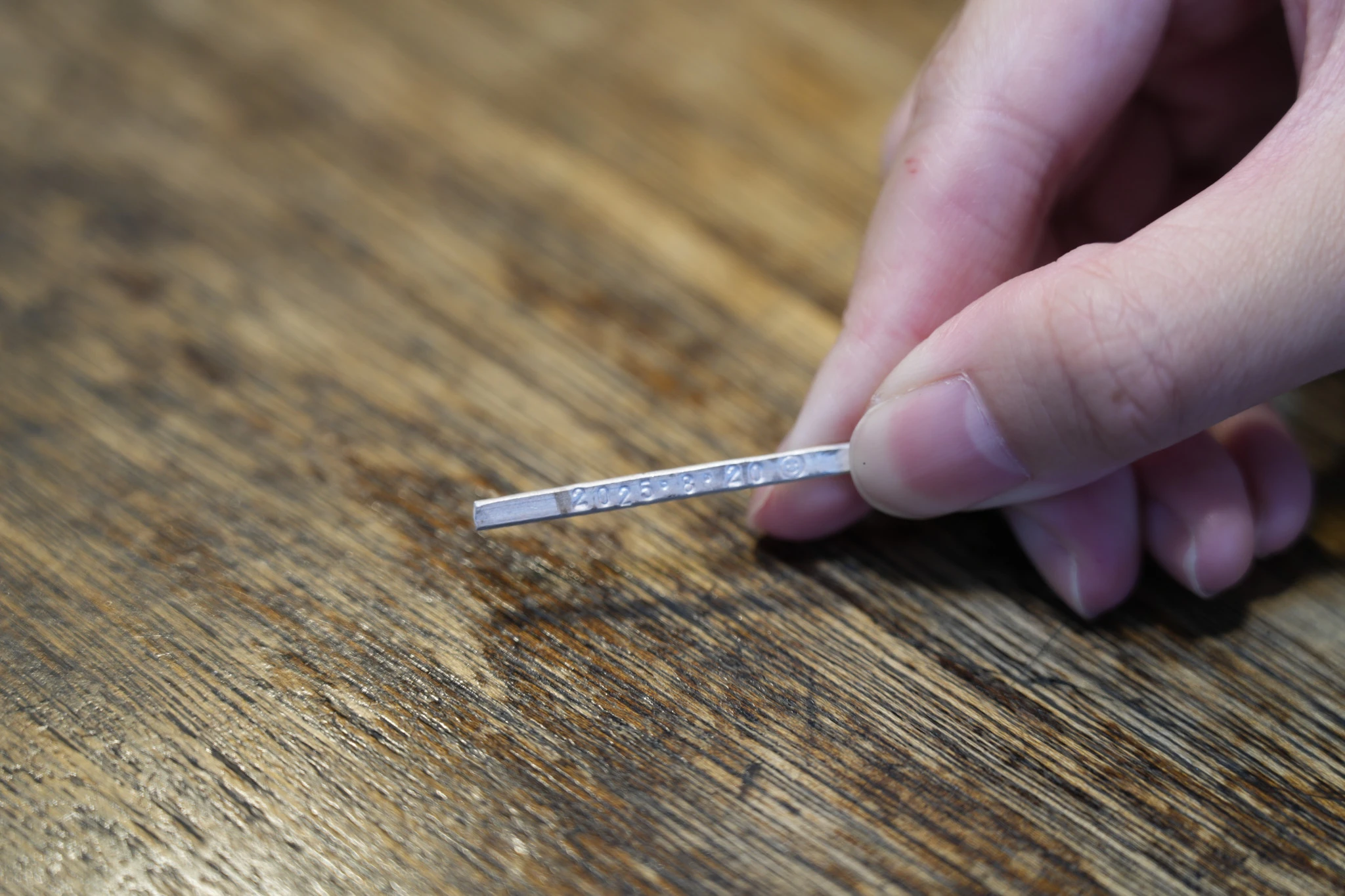 ▼練習完覺得沒問題後,就可以實際將字敲在剛剛的銀條上,老師會幫你做好記號,只需要敲在記號內的範圍即可。