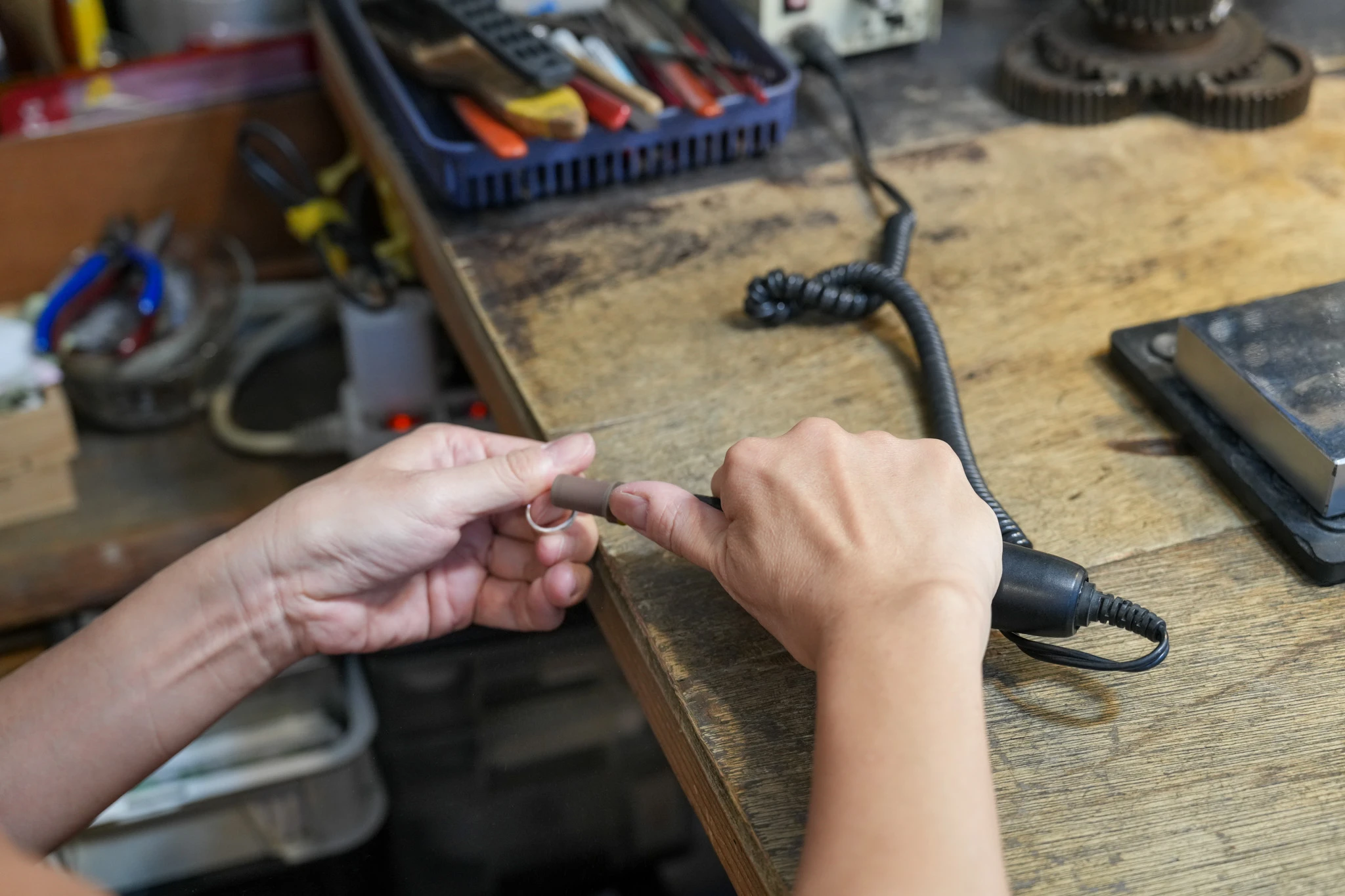 ▼最後會給你搓刀將戒指外圍的白色物質及銲接點磨到看不到,裡面外面都要磨,磨得差不多後,老師會幫你做其他的精修,然後給你砂紙做最後的打磨。