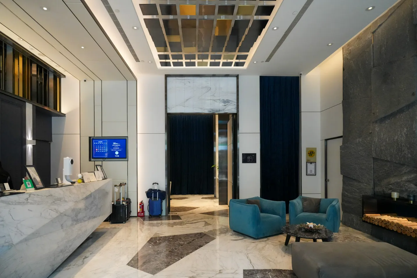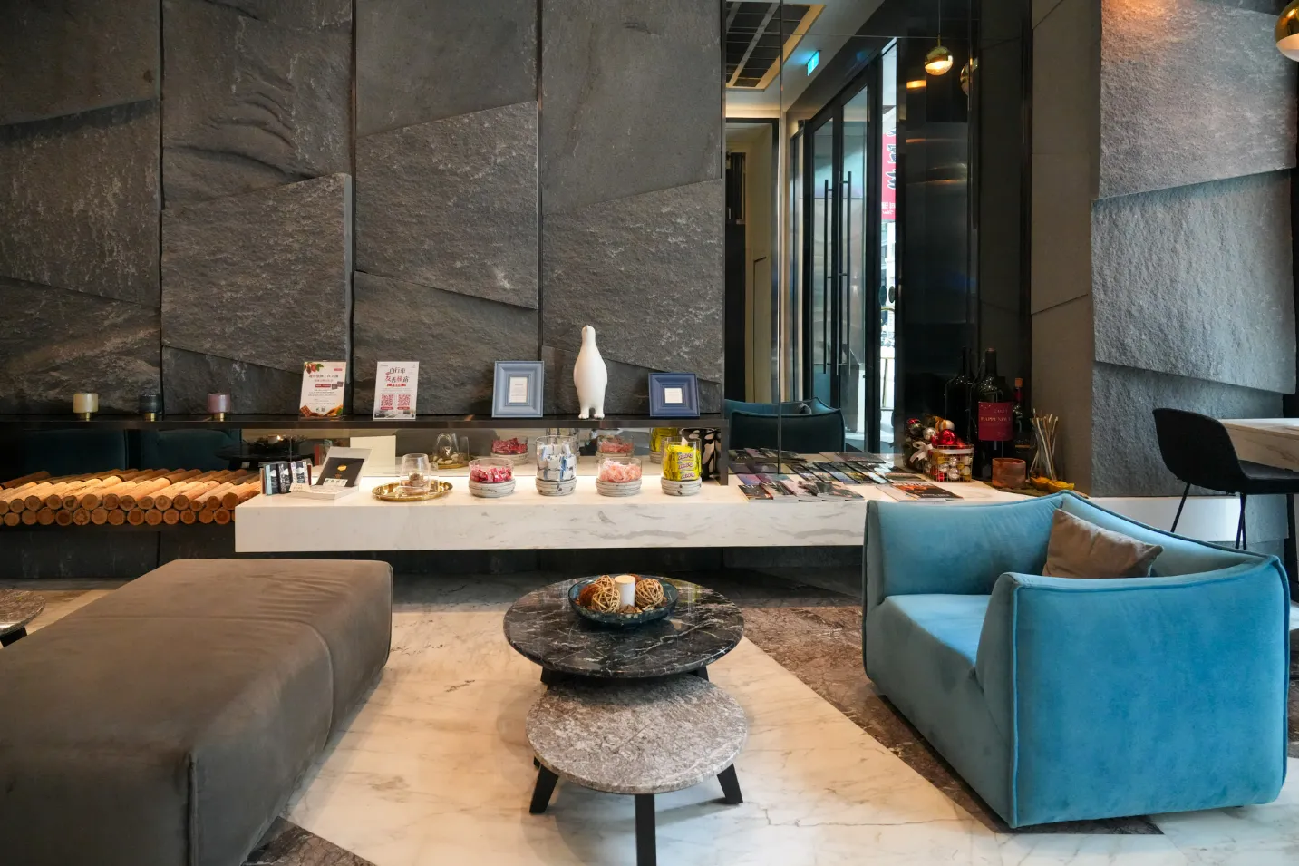 ▼大廳空間不大,但挑高的設計讓整個空間不至於太擁擠或有壓迫感,裝潢風格同樣以現代摩登風為主,以不同的石材做設計,給人賓至如歸的感覺。