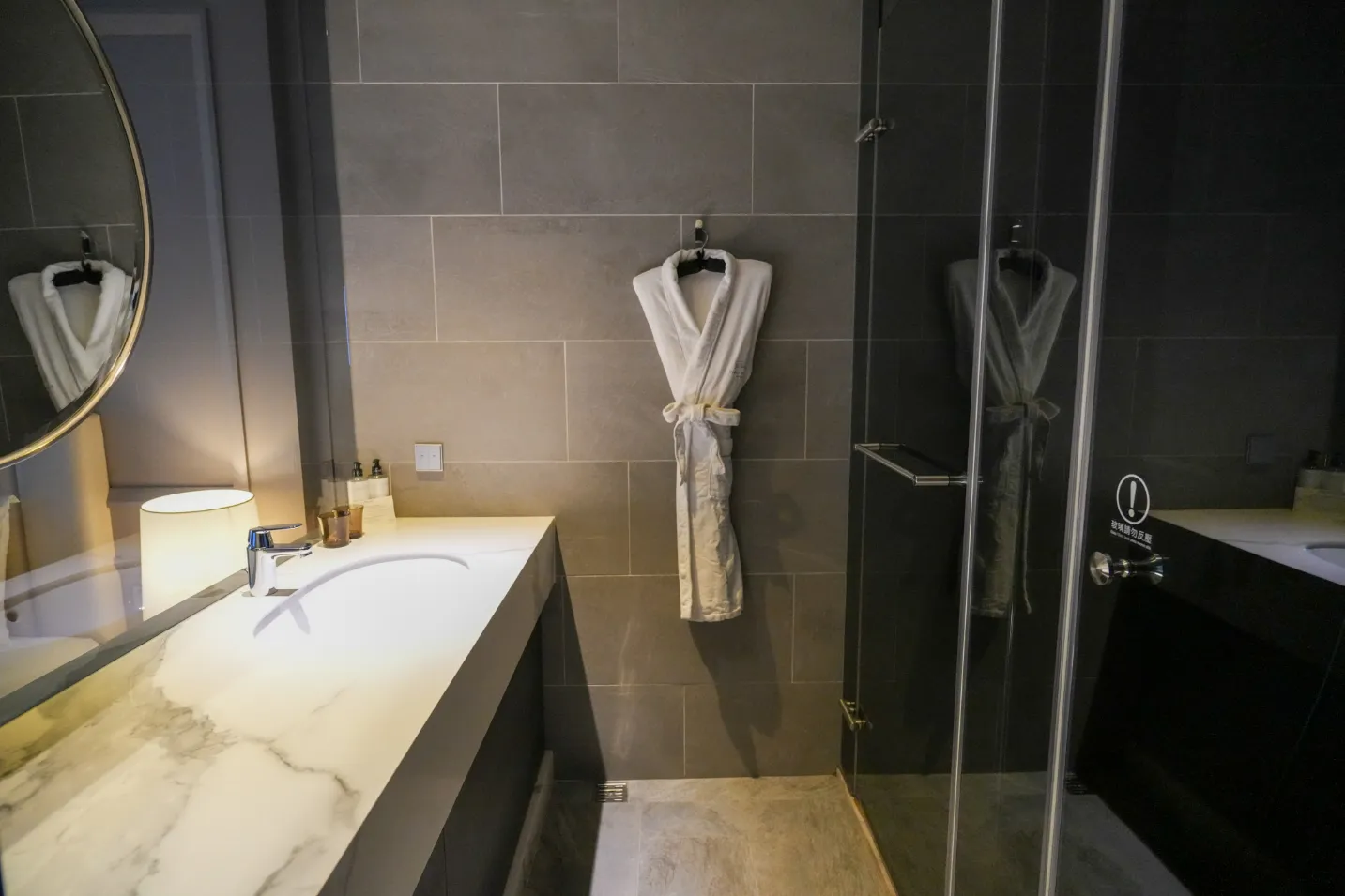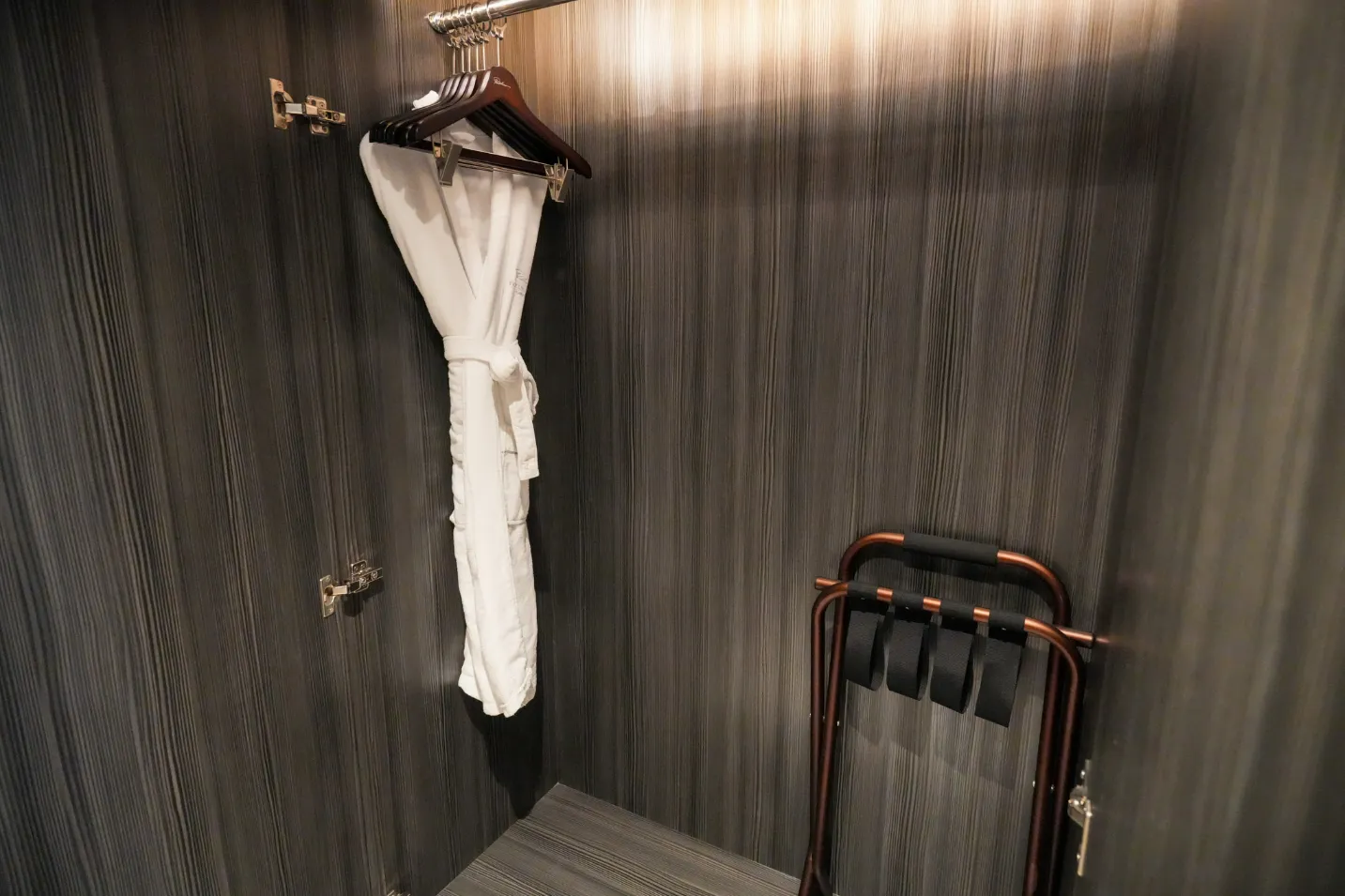 ▼一打開房門會先經過廁所及衣櫃,然後才是臥室空間,廁所的部分採用乾濕分離,馬桶和衛浴設備各有一個空間,外側則是洗手台及鏡子,旁邊有提供浴袍可以使用。