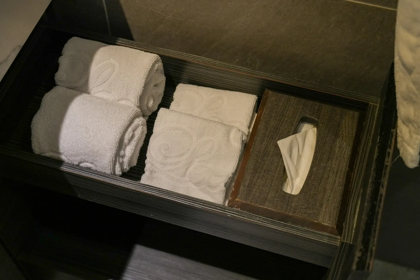 ▼擦手巾、小毛巾和衛生紙則是收納在洗手台下的小抽屜中,吹風機提供的是荷蘭公主的旅行用吹風機。