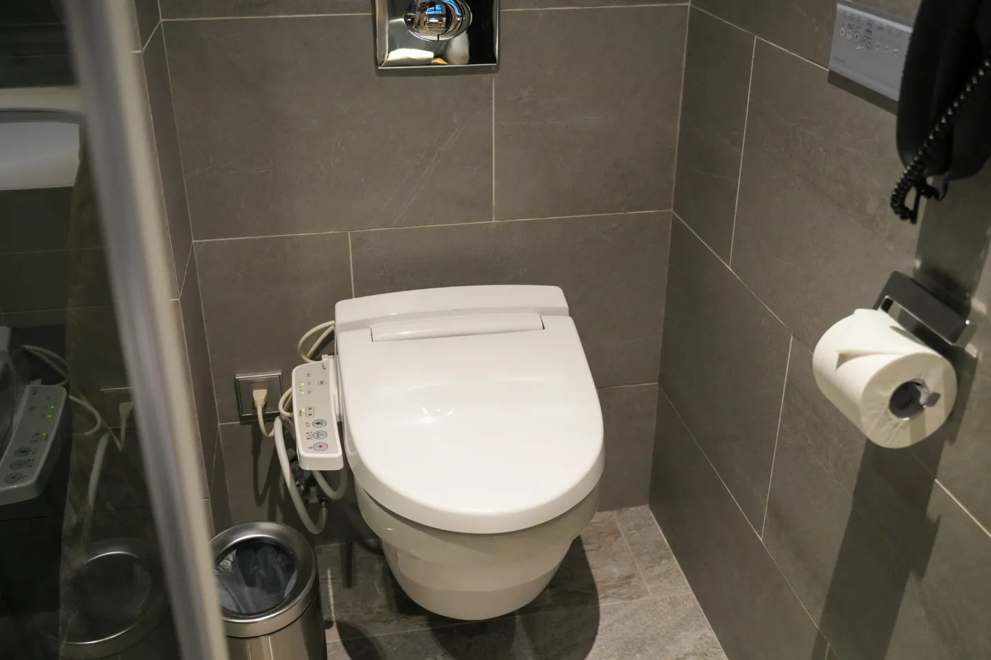 ▼馬桶的部分是配備INAX免治馬桶,不過免治坐墊似乎是另外裝上去的,所以坐起來覺得有點小,不太舒服,建議可以直接換成一體成形的免治馬桶,或是使用原本的馬桶坐墊即可。