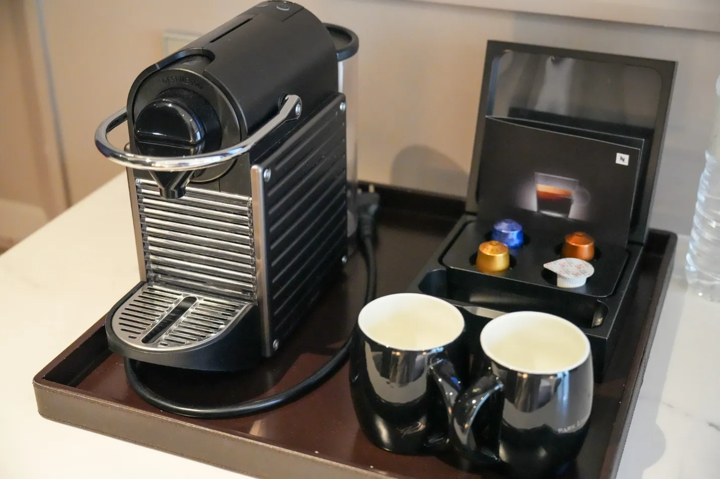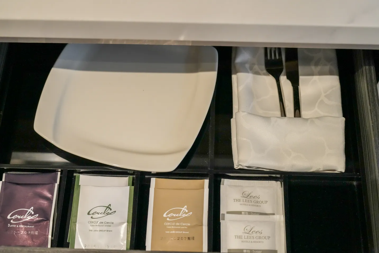 ▼另一側則是電視、Mini Bar及小小的辦公空間,Mini Bar的部分有提供Nespresso的膠囊咖啡機,旁邊有附贈三種不同口味的咖啡膠囊及奶精球,下方抽屜打開有三種不同的茶包及砂糖包,還有刀叉及盤子可以使用。